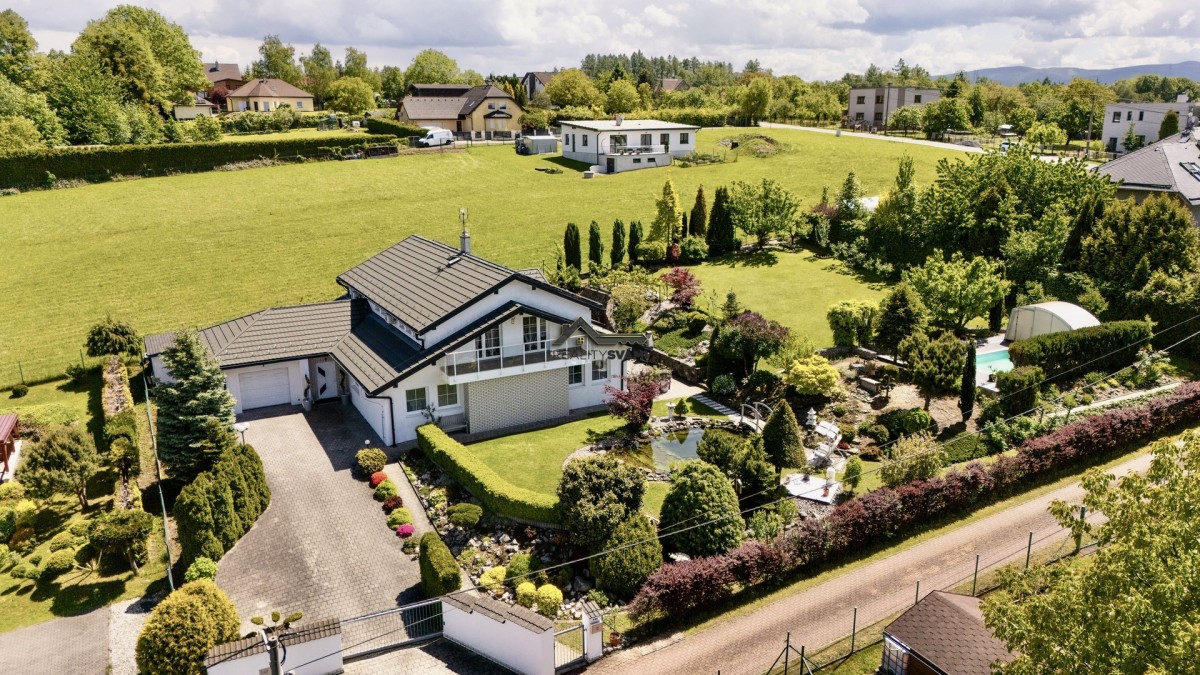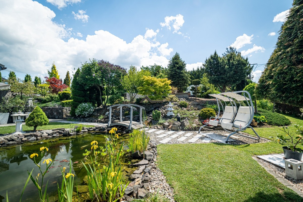 Zahrada, na jejímž pozemku se dům nachází, tvoří opravdovou oázu klidu a krásy. Najdete zde bazén s protiproudem, romantické jezírko s potůčkem, KOI kapry a jesetery a také krytou terasu orientovanou na jih — ideální místo pro odpočinek u kávy nebo večerní sklenky vína. Nechybí ani vinný sklípek a bohatá flóra, která obklopuje celý dům jako zelený ráj.
