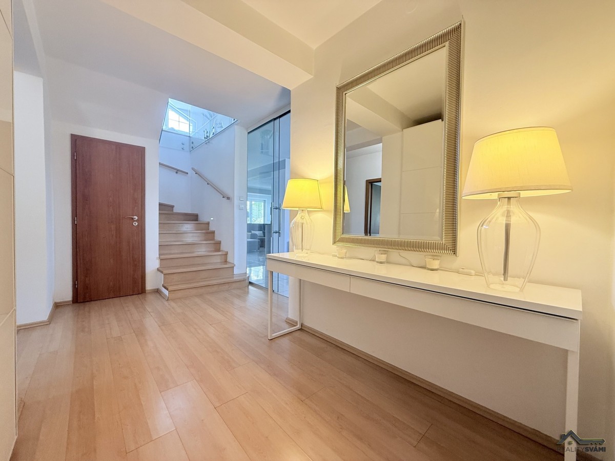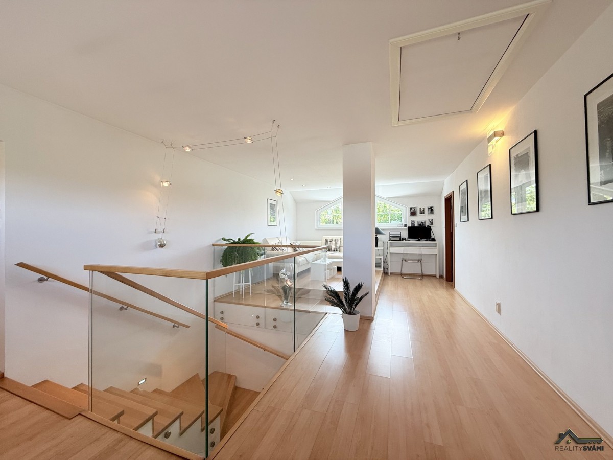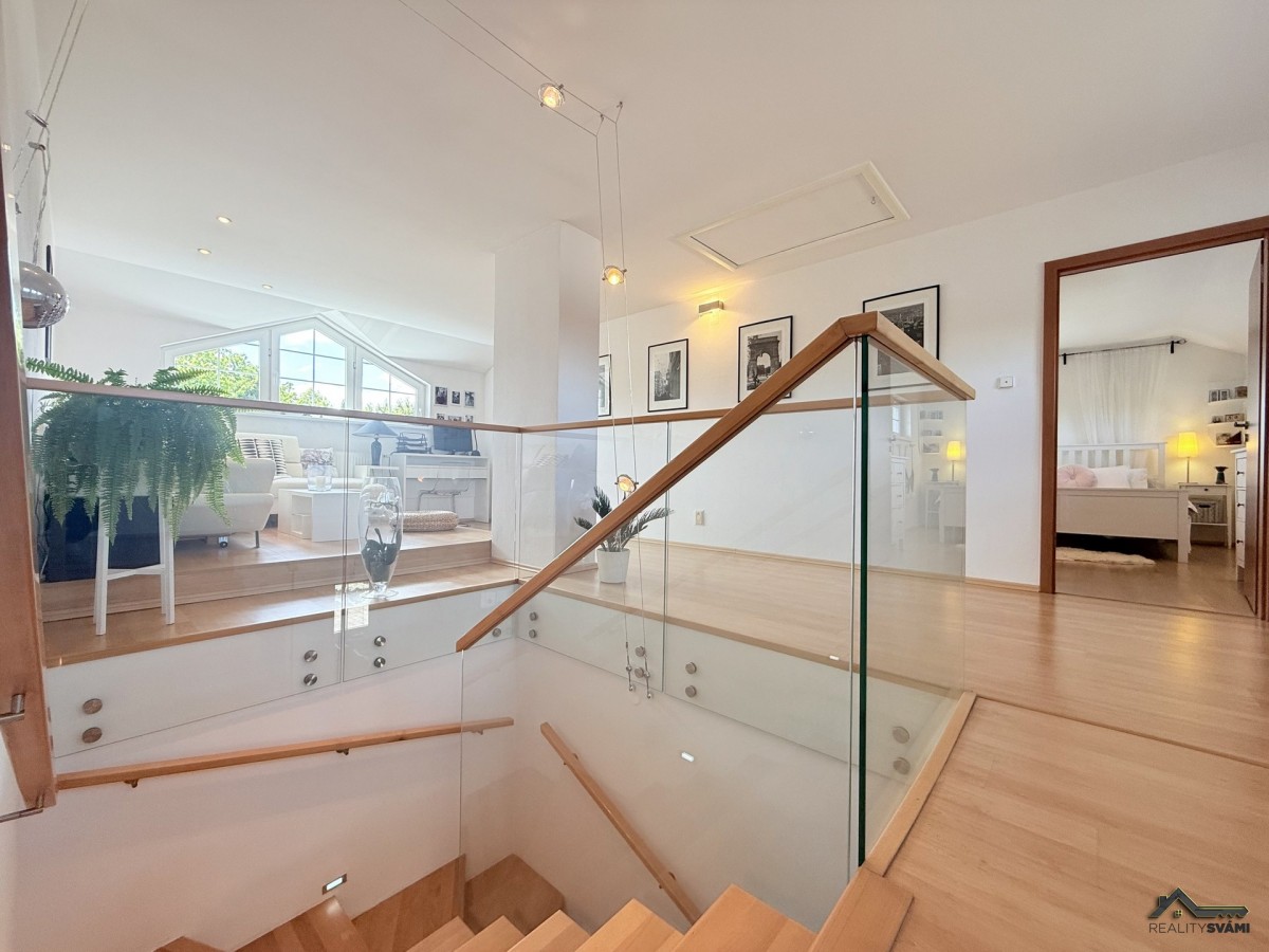 V patře se nachází hlavní ložnice se šatnou, elegantní koupelna s ozvučením, dvě další ložnice se společným balkonem a velkorysá galerie určená pro odpočinek či domácí pracovnu.