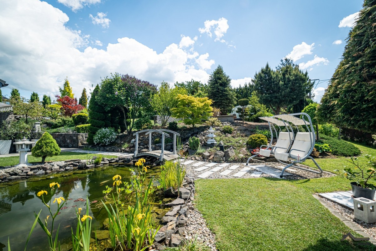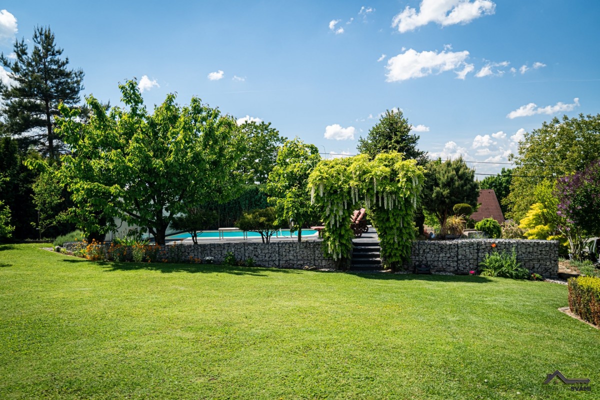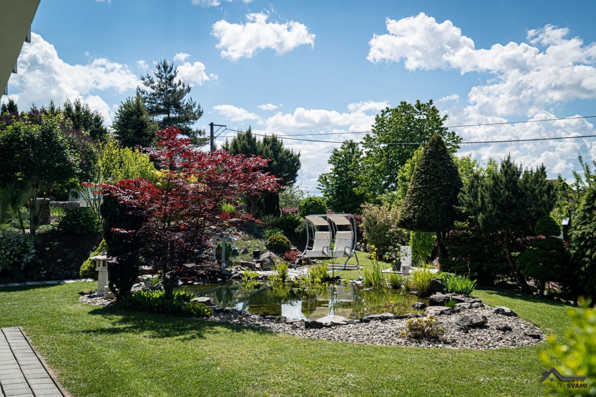 Najdete zde zastřešený bazén s protiproudem, romantické jezírko s potůčkem, KOI kapry i jesetery, jižně orientovanou krytou terasu poskytující klid a naprosté soukromí. Okrasné dřeviny, ovocné stromy, zeleninové záhony a zahradní domek se sklípkem dotvářejí prostředí, které působí harmonicky a zároveň prakticky.