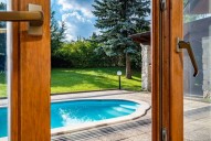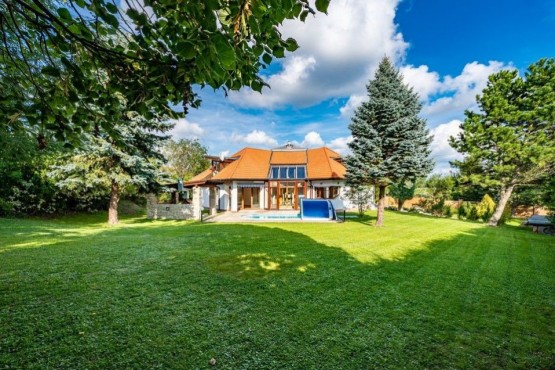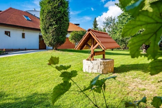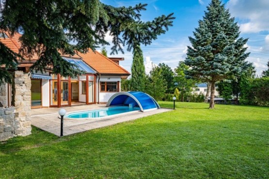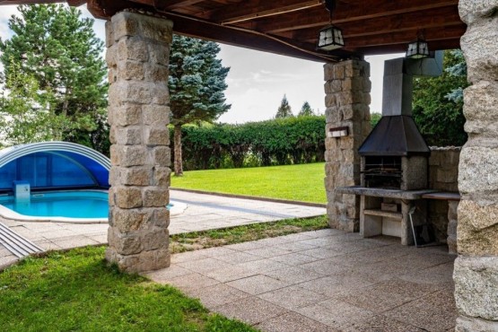 Na zahradě je k dispozici zastřešený bazén s protiproudem, kamenný letní altán s posezením a krbem, zpevněné parkovací stání pro 2 automobily, prostorná garáž pro 2 automobily na dálkové ovládání. Na pozemku se nachází nádrž na dešťovou vodu s čerpadlem s možností využití k zalévání zahrady. Přístřešek pro uskladnění dřeva. Celý pozemek se vrostlými ovocnými stromy a keři je kompletně oplocený zděnou okrasnou stěnou a vjezd do domu umožňuje na zakázku zhotovená kovová brána na dálkové ovládání.
