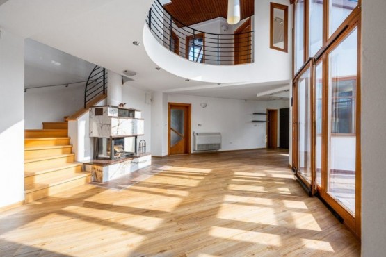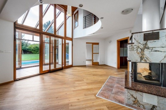 Dispozice dvoupatrového domu je v přízemí tvořena otevřeným a prosluněným konceptem haly s krbem, jídelnou, obývacím pokojem a zimní zahradou s přímým vstupem na terasu s pergolou a následně do moc hezké udržované zahrady, dále prostorná kuchyně se skladem na potraviny, 1pokoj s flexibilním využitím(ložnice, pracovna, pokoj pro hosty, šatna), koupelna se sprchovým koutem, umyvadlem a toaletou. 1. patro zahrnuje tři velké ložnice, prostornou koupelnu s vanou, další koupelnu s oknem.