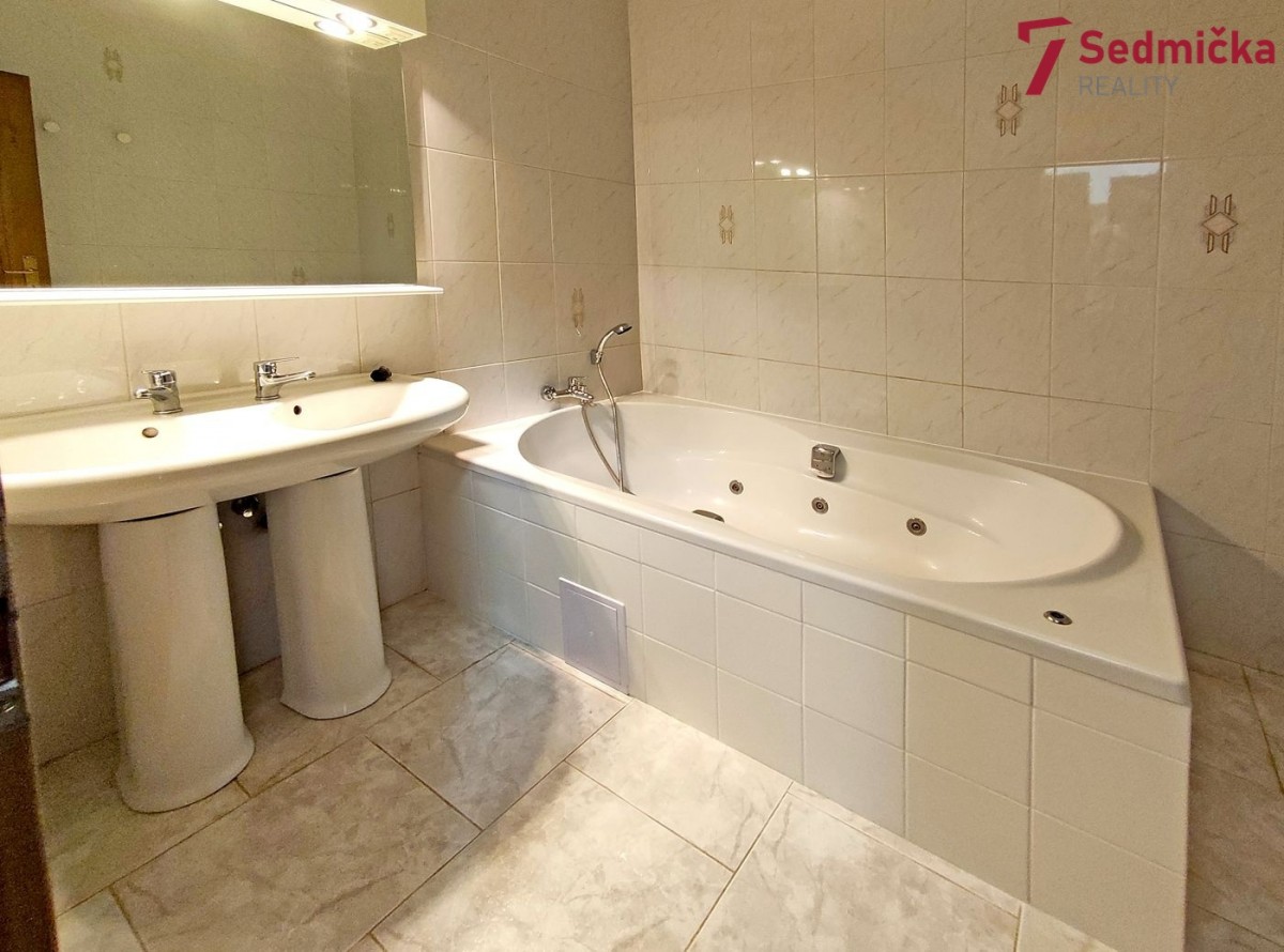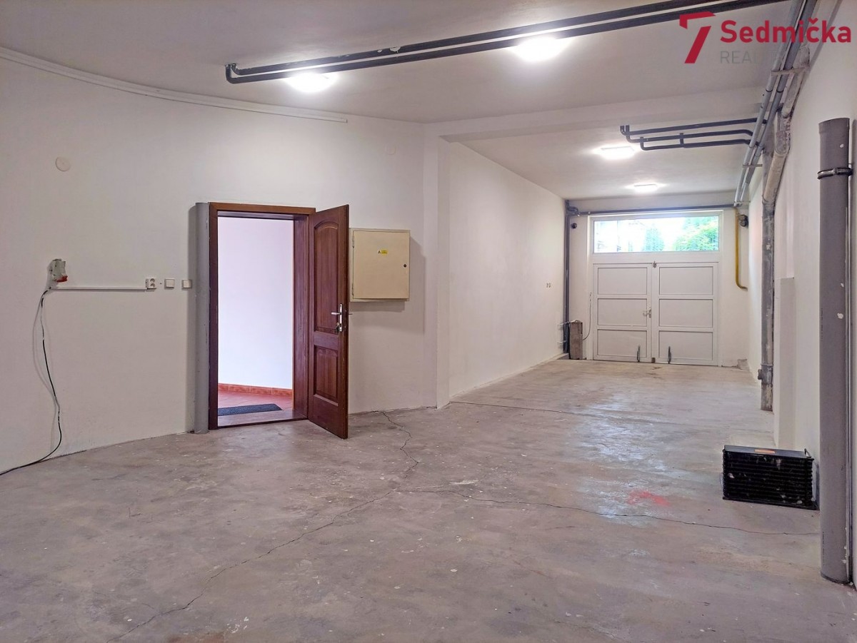V přízemí je garáž na tři automobily a za domem zahrada s výměrou 558 m2.