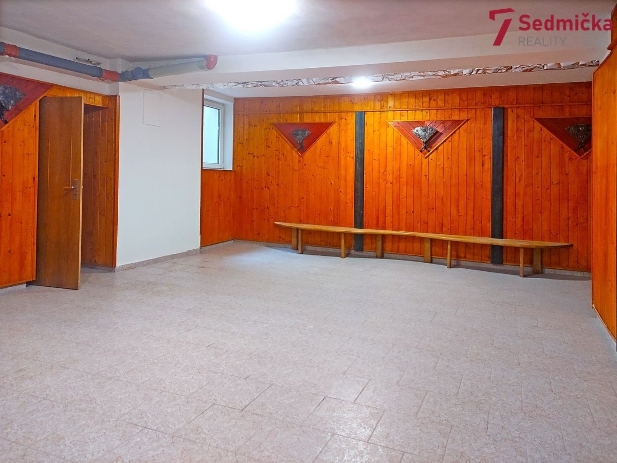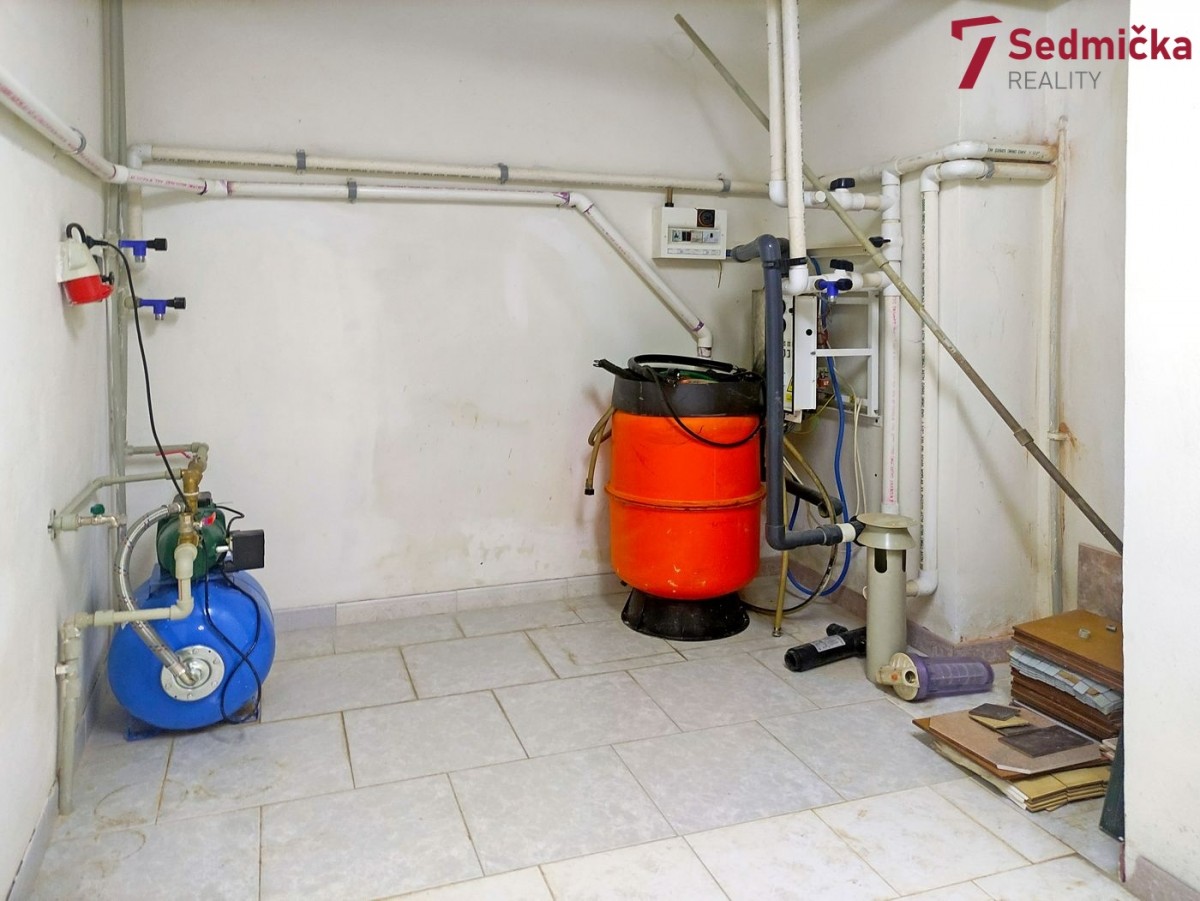 V suterénu je velká společenská místnost, která může sloužit jako kulečníková herna, kotelna s plynovým kotlem, úpravna vody pro bazén, sklad, chladící box a malá kuchyň.