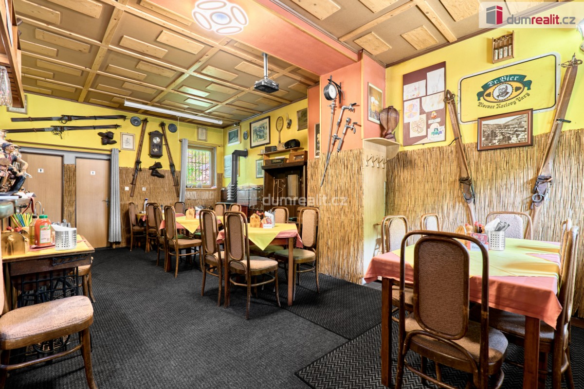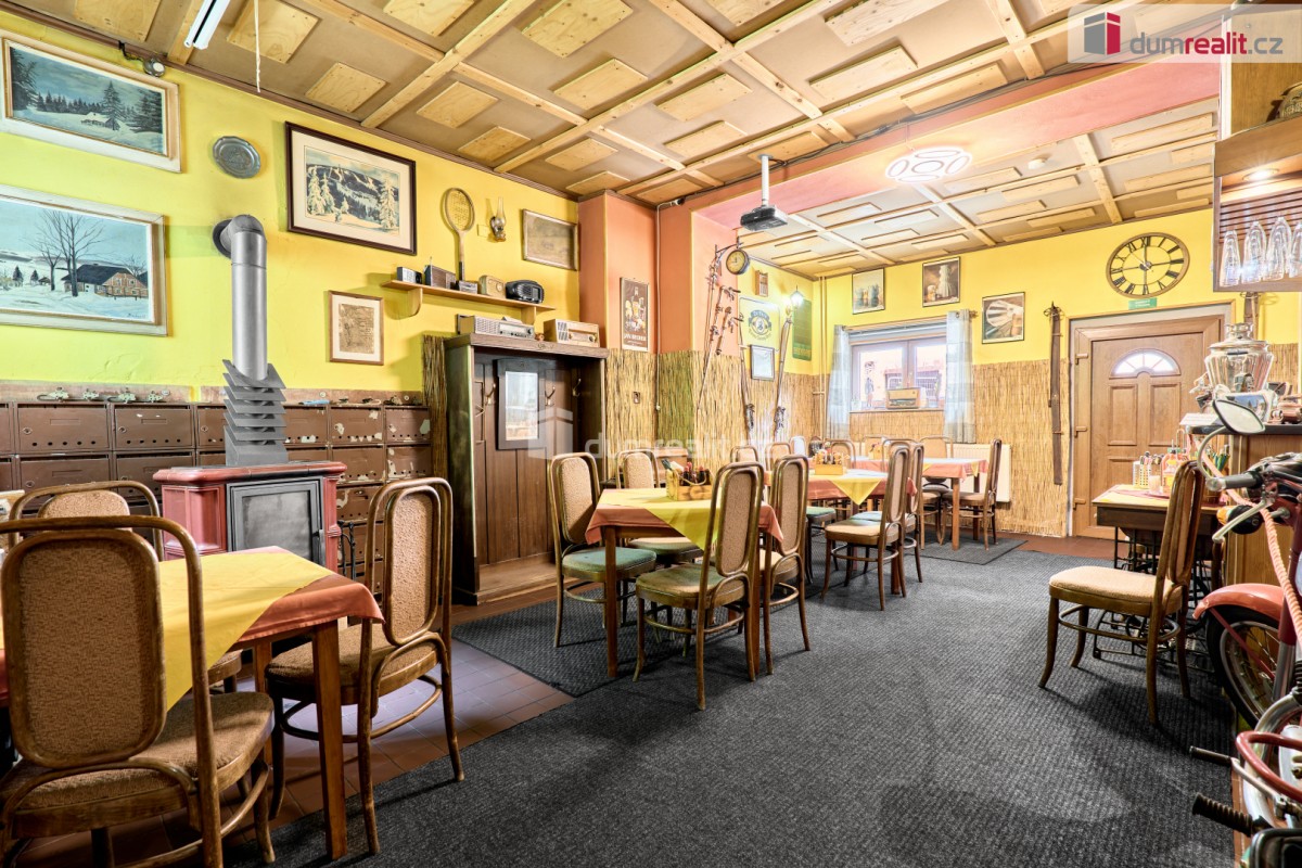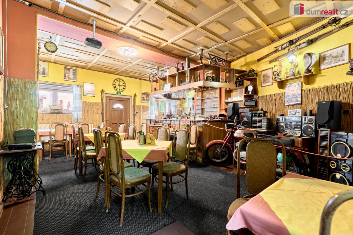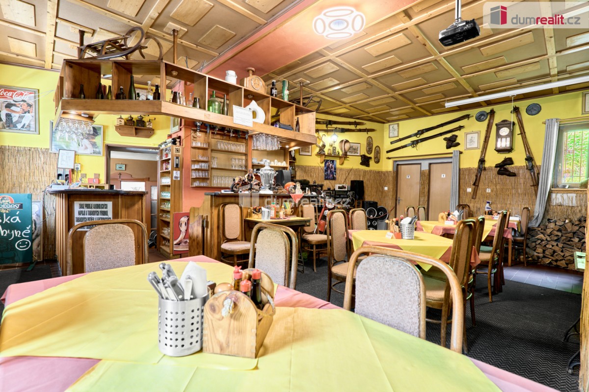 V přízemí této nemovitosti se nachází zavedená restaurace včetně stálé klientely s kapaci...tou 20 míst, kompletně vybavenou kuchyní a barem. Restaurace má možnost rozšíření o vnitřní venkovní terasu pro další hosty. Dále v přízemí najdete pánské a dámské toalety, skladové prostory a kotelnu s kotlem na tuhá paliva včetně zásobníku. Vytápění domů a ohřev vody je zajištěn tímto kotlem.