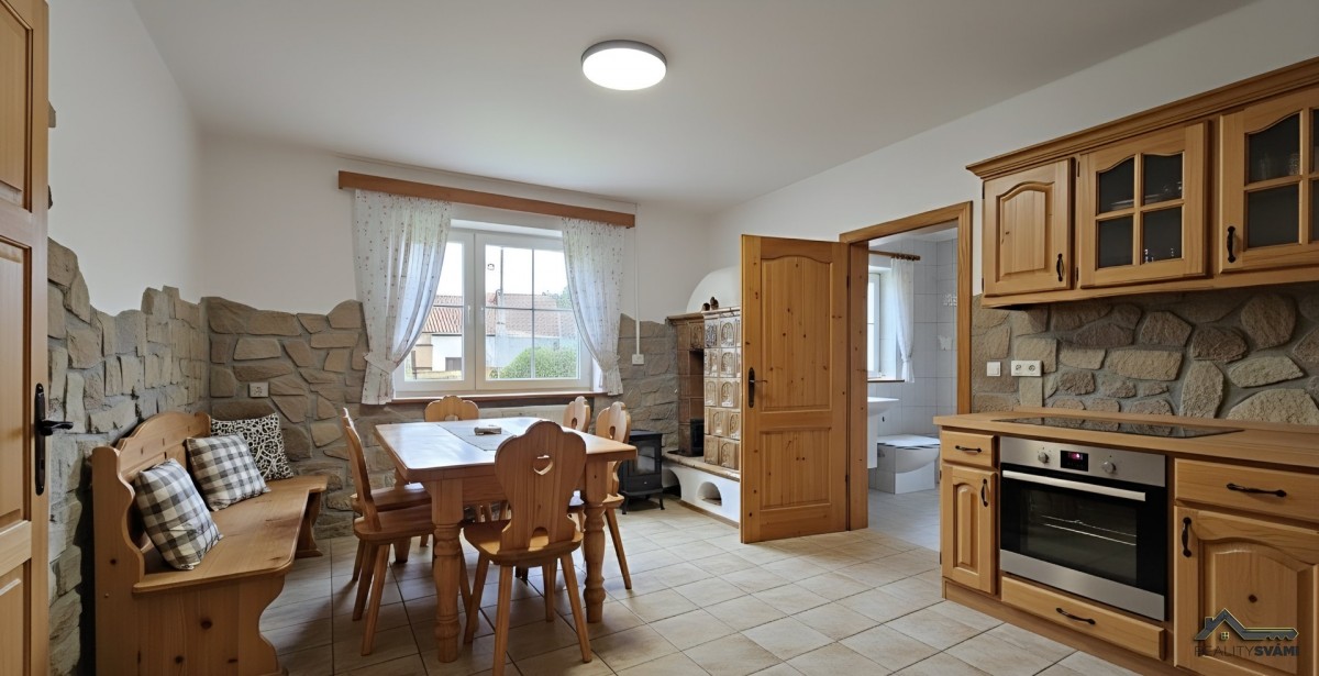 K dispozici jsou kachlová kamna i plynový sporák s troubou v kuchyni.