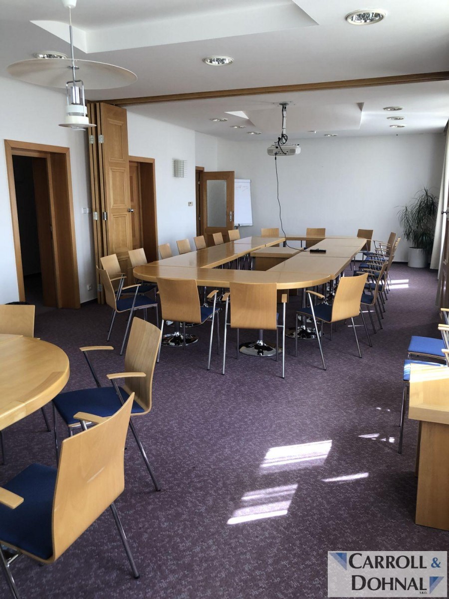 2. nadzemní podlaží : 130m2 vybavených kancelářských prostor sestávajících se ze samostatné kanceláře 20m2 a konferenční místnosti 60m2, kterou lze rozdělit na dvě samostatné místnosti, dále plně vybavenou kuchyň a sociální zázemí.