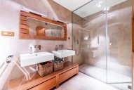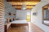 2. NP (druhé nadzemní patro): Hlavní ložnice s rohovým oknem a neopakovatelnými výhledy do zahrady tvořící open space spolu s koupelnou a vlastním (odděleným) sociální zařízení WC, dále 2 dvoulůžkové a jedna třílůžková ložnice pro hosty, koupelna a sociální zařízení WC pro hosty.