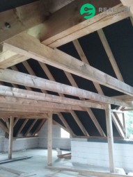 1PP (částečně odkryté mírný svah), 1NP (první nadzemní patro), podkroví, obytná půda. Stavba je z keramických tvarovek s plánovaným zateplením. Stropy Spirol, vnější úprava dle projektu kombinace bílé omítky a dřevěného obkladu s možností změny před dokončením. Střecha s plechovou krytinou (r. 2023) 10 let záruka. Podzemní části jsou zatepleny XPS 10 cm a chráněny dvouvrstvou SBS hydroizolací. Komín je stavebnicový s nerezovou vložkou. Interiérové tesařské konstrukce střechy s již hoblovanými vodorovnými nosníky (kleštiny) a podpěrnými trámy, plánované jako pohledové; podbití přesahů střechy na všech štítech hotové s povrchovou úpravou. Dispozice interiéru není dokončena, lze upravit dle vlastních potřeb.