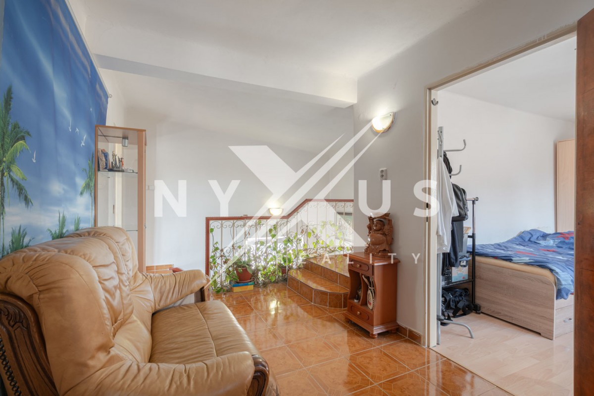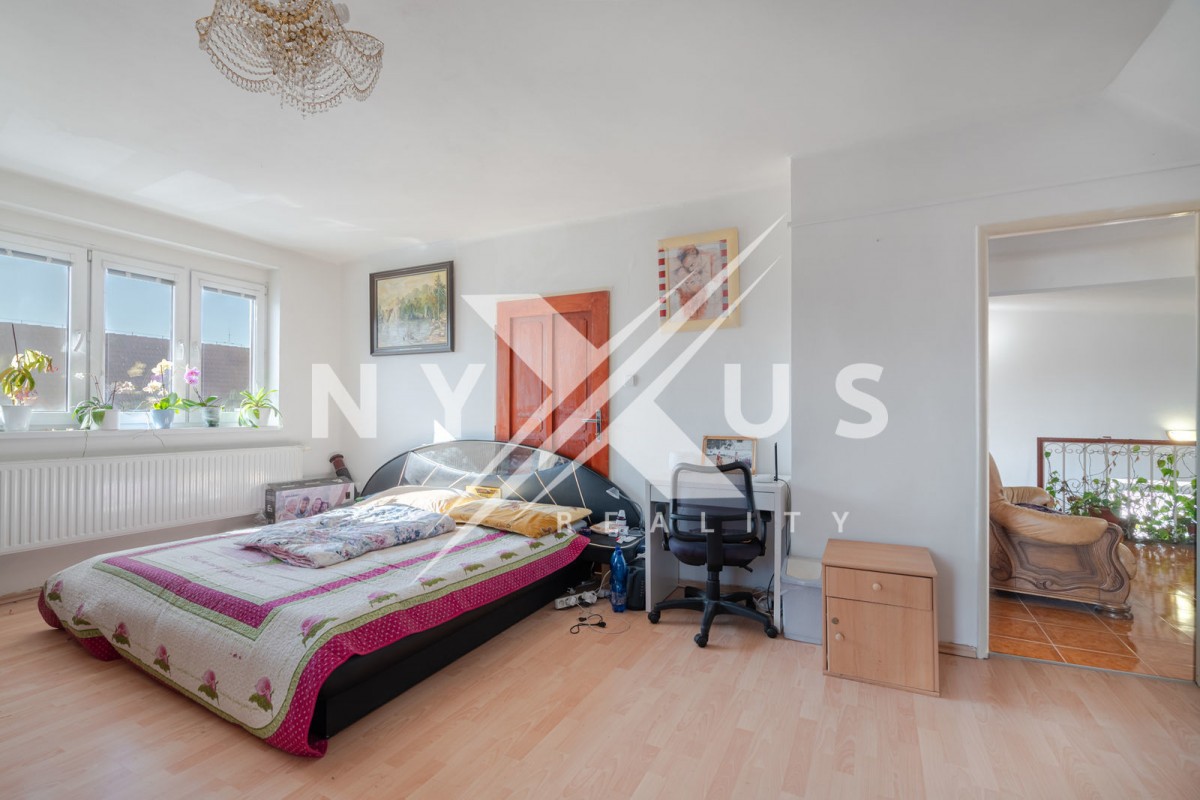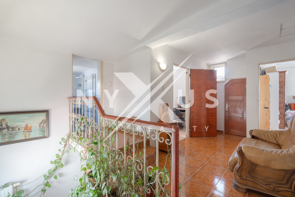 V obytném patře jsou k dispozici tři pokoje, chodba, koupelna s rohovou vanou, toaletou a bidetem, vstup na menší půdu a balkón.