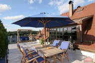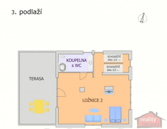 Horní, třetí podlaží je koncipováno jako velká otevřená ložnice (70 m) s elektrickým krbem a pracovním koutem. Je tu šatní skříň na míru, en - suite designová koupelna s vanou a toaletou a opět prostorná terasa. Nad ložnicí je zařízený půdní prostor pro cvičení, úložné prostory apod. (32 m).
