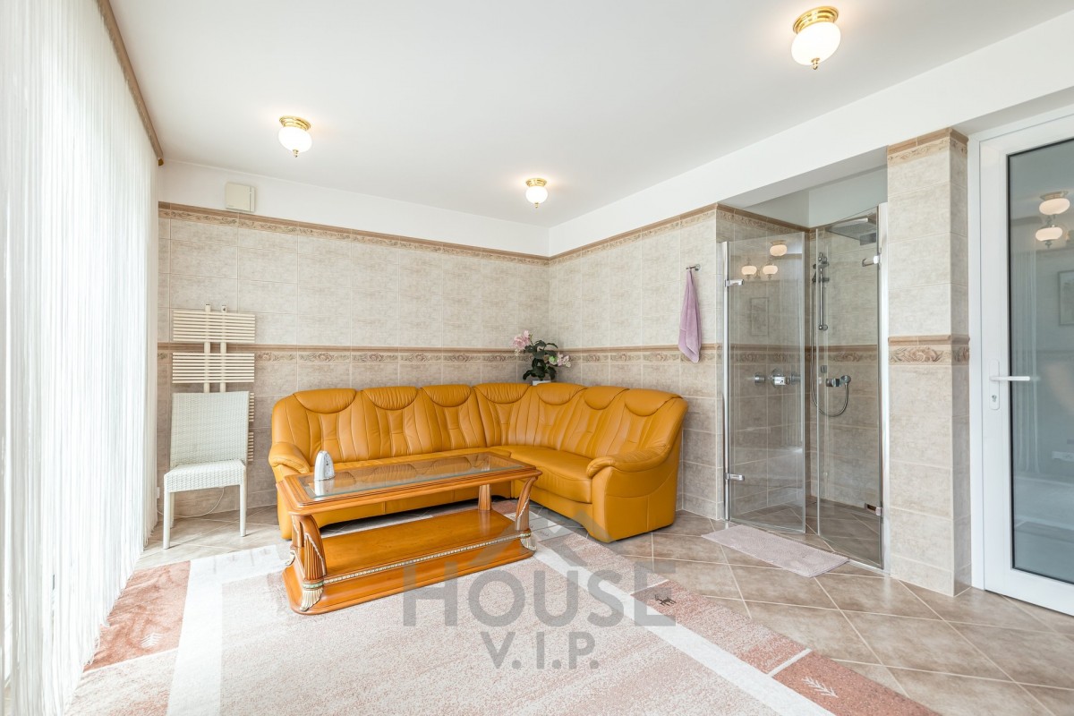 Dále se v patře nacházejí 2 velké zařízené ložnice, každá s vlastní koupelnou, a dobře vybavená pracovna s archivem, technické místnosti - žehlírna s úložnou skříní.