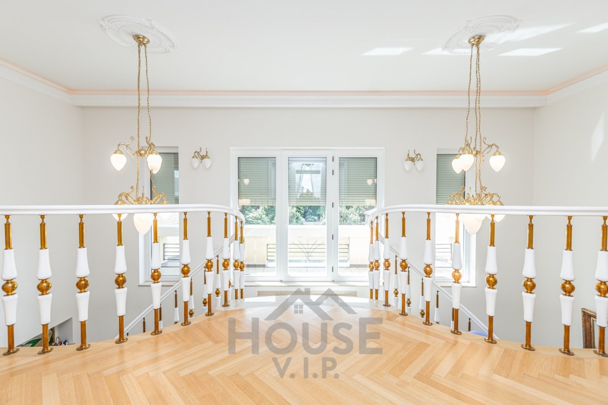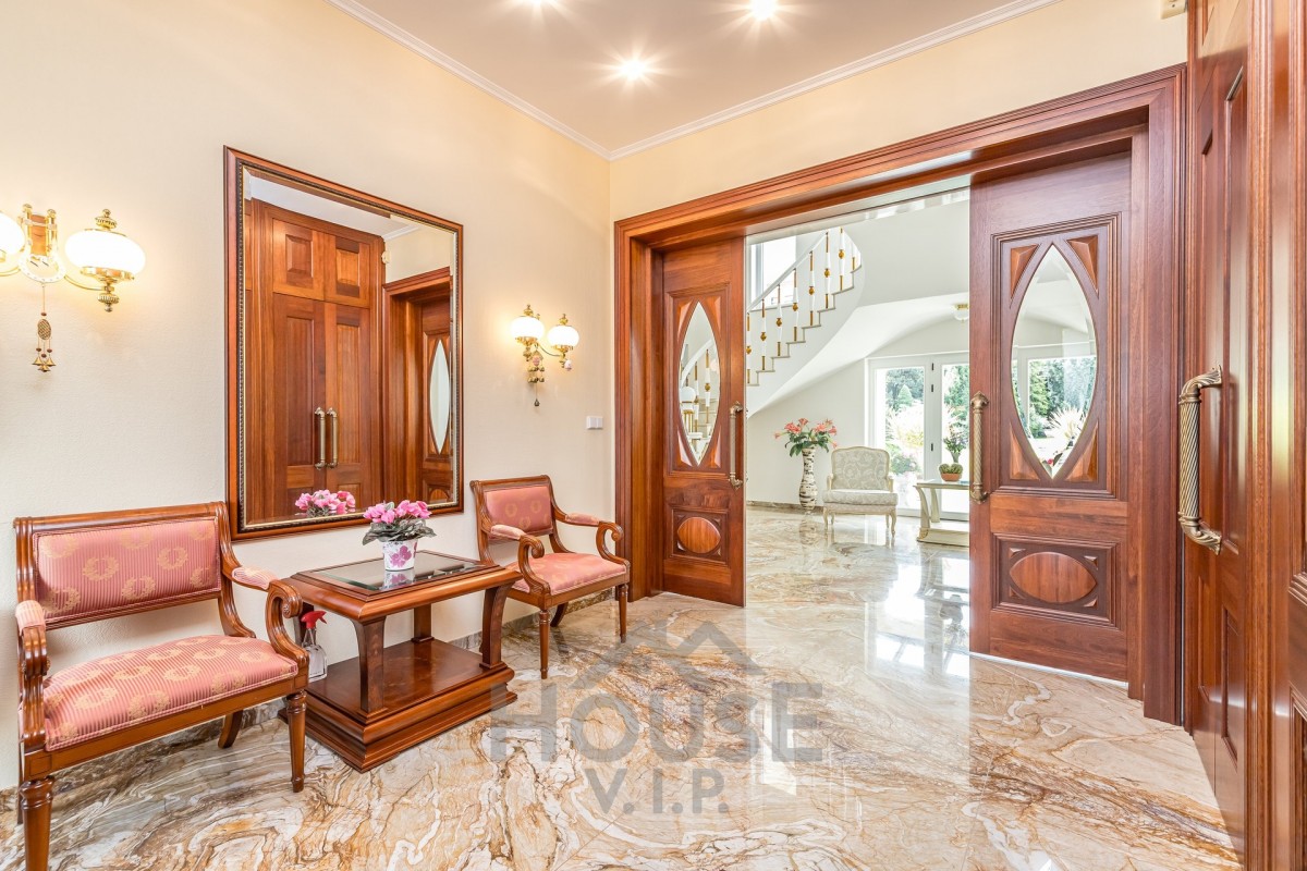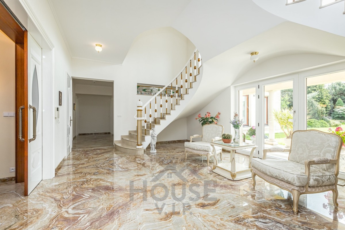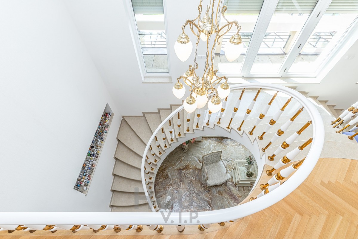 V přízemí domu se nachází velká vstupní hala se vstupem do prostorné šatny. Posuvnými inkrustovanými dveřmi se vchází do velké nádherné haly s mramorovým schodištěm do horního patra a přístupem do moc hezké zahrady, v obou místnostech jsou úžasné mramorové podlahy.