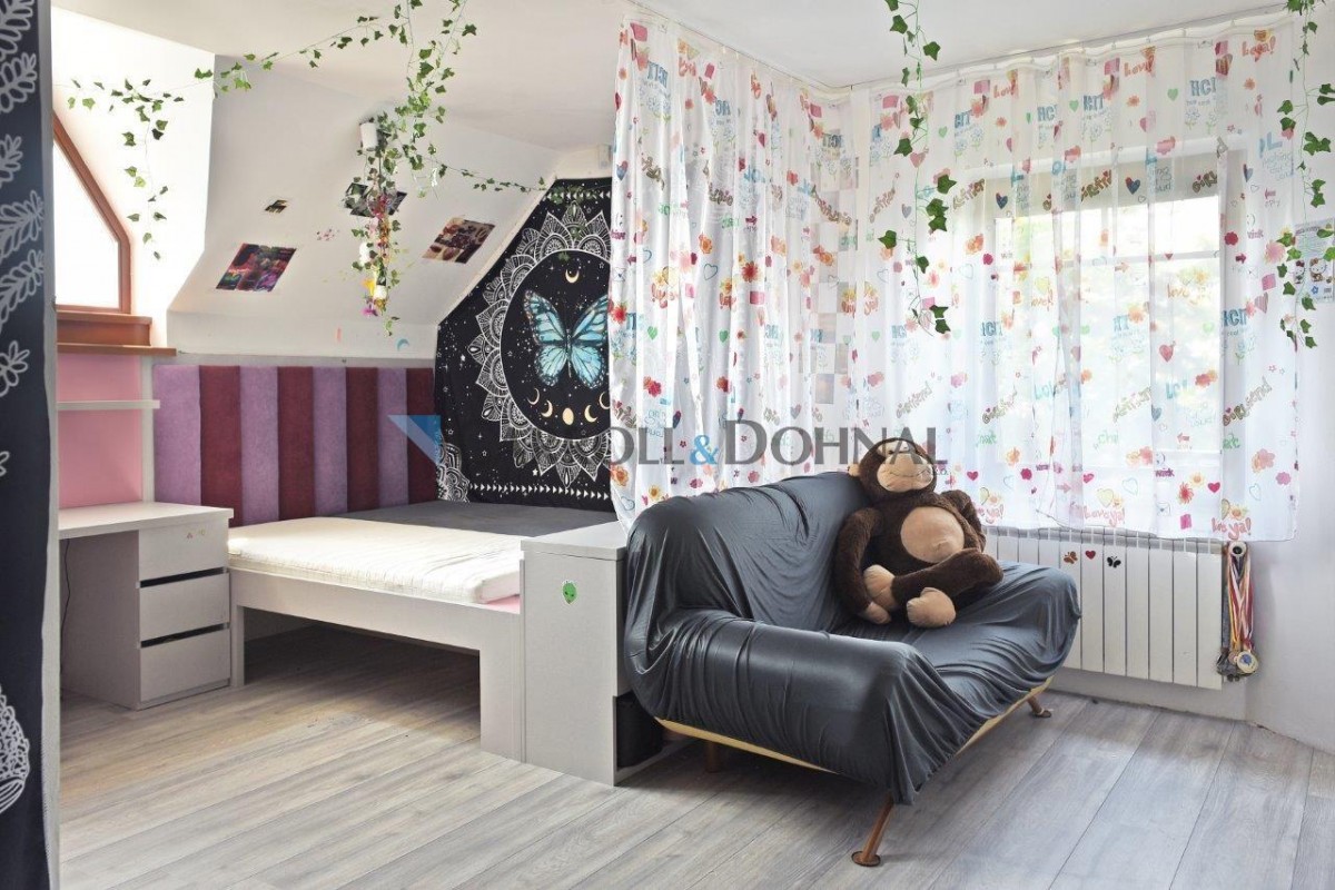 - 2 pokoje, jeden s umyvadlem, druhý s prostornou šatnou. Střešní okna na severní a jižní stranu, výstup po vysunovacích schodech na půdu a střechu RD (rodinný dům)