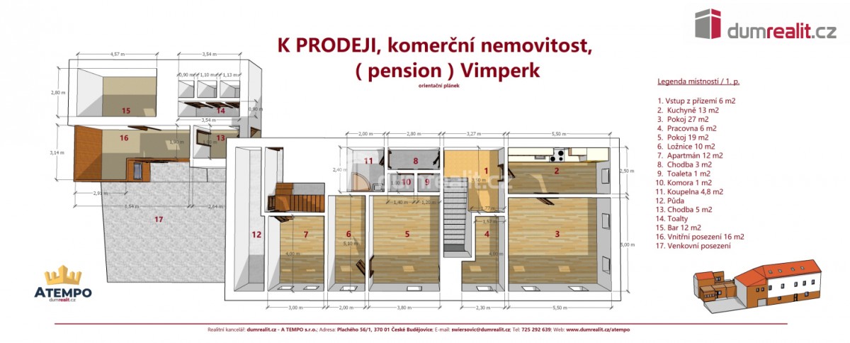 Cena je včetně provize RK a právního servisu. Více info Vám poskytne makléř Zdeněk Swieršovič. . Dumrealit. cz Vám nabízí prodej zavedené komerční nemovitosti (Pension) s bytovou jednotkou a barem ve městě Vimperk, v loka...litě na úpatí Vimperského zámku. Zastavěná plocha nemovitosti činí 408 m² včetně zpevněných ploch a zahrada o velikosti 264 m². Objekt nabízí pokoje s 16 - ti lůžky s možností navýšení, tři samostatné bytové jednotky o dispozici 3+1, 2+1 a 1+kk. Dále se na okraji objektu nachází bar s terasou s vnitřní kapacitou 20 - ti místy a 30 - ti místy na venkovním posezení, který slouží jako další zdroj příjmů. Nad barem je přistavěný samostatný pokoj s vlastním sociálem a terasou. Velkou výhodou je parkování přímo před budovou - kapacita 7 míst. Nemovitost je momentálně využívána k trvalému pobytu s dlouhodobým charakterem a generuje tak pravidelný měsíční příjem i mimo sezónní měsíce. Nemovitost je připojena na veřejný vodovod a městskou kanalizaci. Vytápění je řešeno kotlem na pelety se zásobníkem. Vimperk je branou na Šumavu a v dojezdové vzdálenosti 20 minut jsou turisticky vyhledávané lokality jako Kvilda, Borová Lada nebo Srní. Majitel nemovitost prodává ze zdravotních důvodů. Pokud hledáte nemovitost, která generuje pravidelný měsíční příjem, nebo chcete ochránit své úspory proti inflaci, pak naše nemovitost je právě pro Vás. Zajistíme Vám financování a veškerý právní servis. Více info poskytne zájemcům realitní makléř Zdeněk Swiersovič z RK A TEMPO fungující pod obchodní známkou dumrealit. Těšíme se na prohlídce. Ev. číslo: 644697. Energetický štítek: G