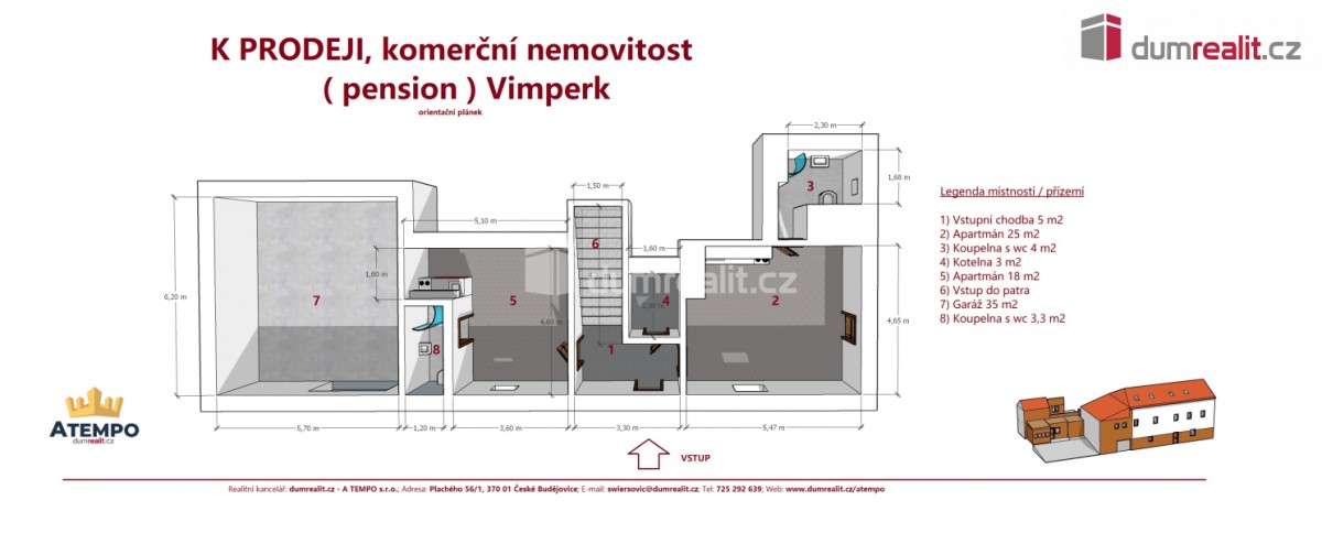 Cena je včetně provize RK a právního servisu. Více info Vám poskytne makléř Zdeněk Swieršovič. . Dumrealit. cz Vám nabízí prodej zavedené komerční nemovitosti (Pension) s bytovou jednotkou a barem ve městě Vimperk, v loka...litě na úpatí Vimperského zámku. Zastavěná plocha nemovitosti činí 408 m² včetně zpevněných ploch a zahrada o velikosti 264 m². Objekt nabízí pokoje s 16 - ti lůžky s možností navýšení, tři samostatné bytové jednotky o dispozici 3+1, 2+1 a 1+kk. Dále se na okraji objektu nachází bar s terasou s vnitřní kapacitou 20 - ti místy a 30 - ti místy na venkovním posezení, který slouží jako další zdroj příjmů. Nad barem je přistavěný samostatný pokoj s vlastním sociálem a terasou. Velkou výhodou je parkování přímo před budovou - kapacita 7 míst. Nemovitost je momentálně využívána k trvalému pobytu s dlouhodobým charakterem a generuje tak pravidelný měsíční příjem i mimo sezónní měsíce. Nemovitost je připojena na veřejný vodovod a městskou kanalizaci. Vytápění je řešeno kotlem na pelety se zásobníkem. Vimperk je branou na Šumavu a v dojezdové vzdálenosti 20 minut jsou turisticky vyhledávané lokality jako Kvilda, Borová Lada nebo Srní. Majitel nemovitost prodává ze zdravotních důvodů. Pokud hledáte nemovitost, která generuje pravidelný měsíční příjem, nebo chcete ochránit své úspory proti inflaci, pak naše nemovitost je právě pro Vás. Zajistíme Vám financování a veškerý právní servis. Více info poskytne zájemcům realitní makléř Zdeněk Swiersovič z RK A TEMPO fungující pod obchodní známkou dumrealit. Těšíme se na prohlídce. Ev. číslo: 644697. Energetický štítek: G