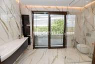 Jsou tady v nižním patře všude takové tlusté zdi 50 cm, že se můžete cítit bezpečně jako v bunkru . V celém domě, promyšleném do detailu, každý pokoj má koupelnu nebo sprchový kout a toaletu s velkoformátovy obklady a sanitou Laufen . V přízemí u hlavního vchodu jsou garáž pro auto a motorky, šatna, pracovna/ložnice s koupelnou , sociální zařízení WC pro hosty , posilovna se saunou, obývací pokoj s krbem a vysokým 6 metrovým stropem s obrovskými okny. Dále je zde jídelna a velká luxusní kuchyně na míru z přírodního dřeva a kamene a vestavné spotřebiče Miele, odkud je vstup na terasu 37 m2. Po schodišti dolů najdete vše pro zábavu a relaxaci: hernu, kinosál s Dolby Atmos systémem a výsuvným plátnem, hobby místnost, prostornou šatnou , prádelnu s chytrou šachtou na prádlo a další technické místnosti.
