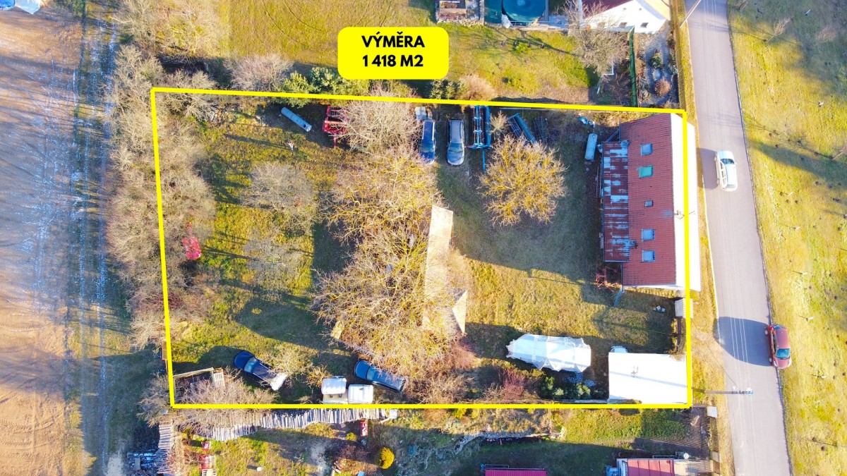Celková výměra pozemku činí 1418 m2. Na pozemku se nachází garáž, hospodářská budova, dřevník a spoustu ovocných stromů, které dodávají pozemku kouzlo a možnost sklizně vlastních plodů. Součástí pozemku je jímka a kopaná studna, která se hodí k zalévání zahrady. Velkou výhodou je také možnost příjezdu na pozemek z přední i zadní strany.