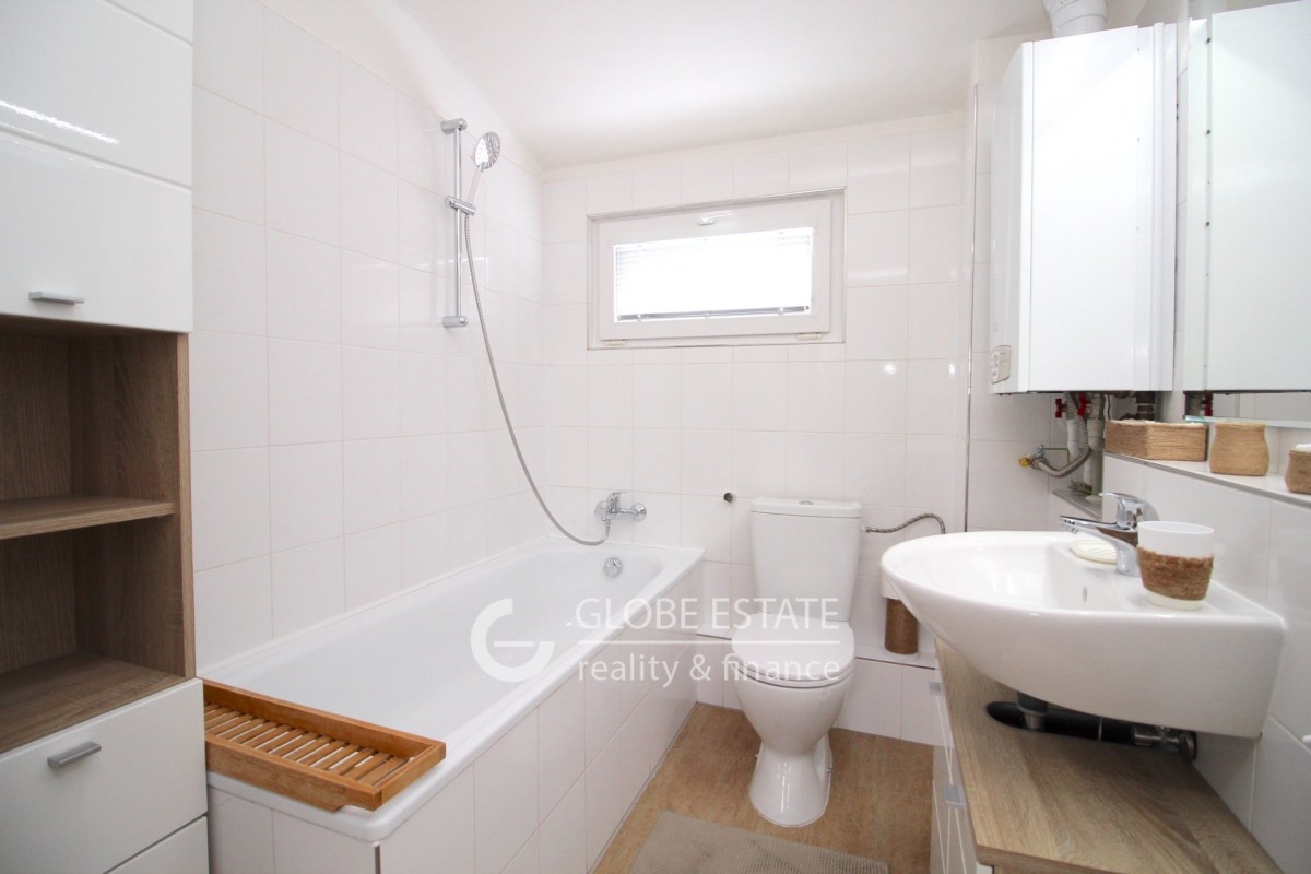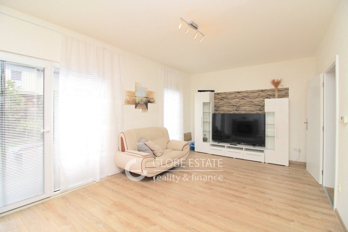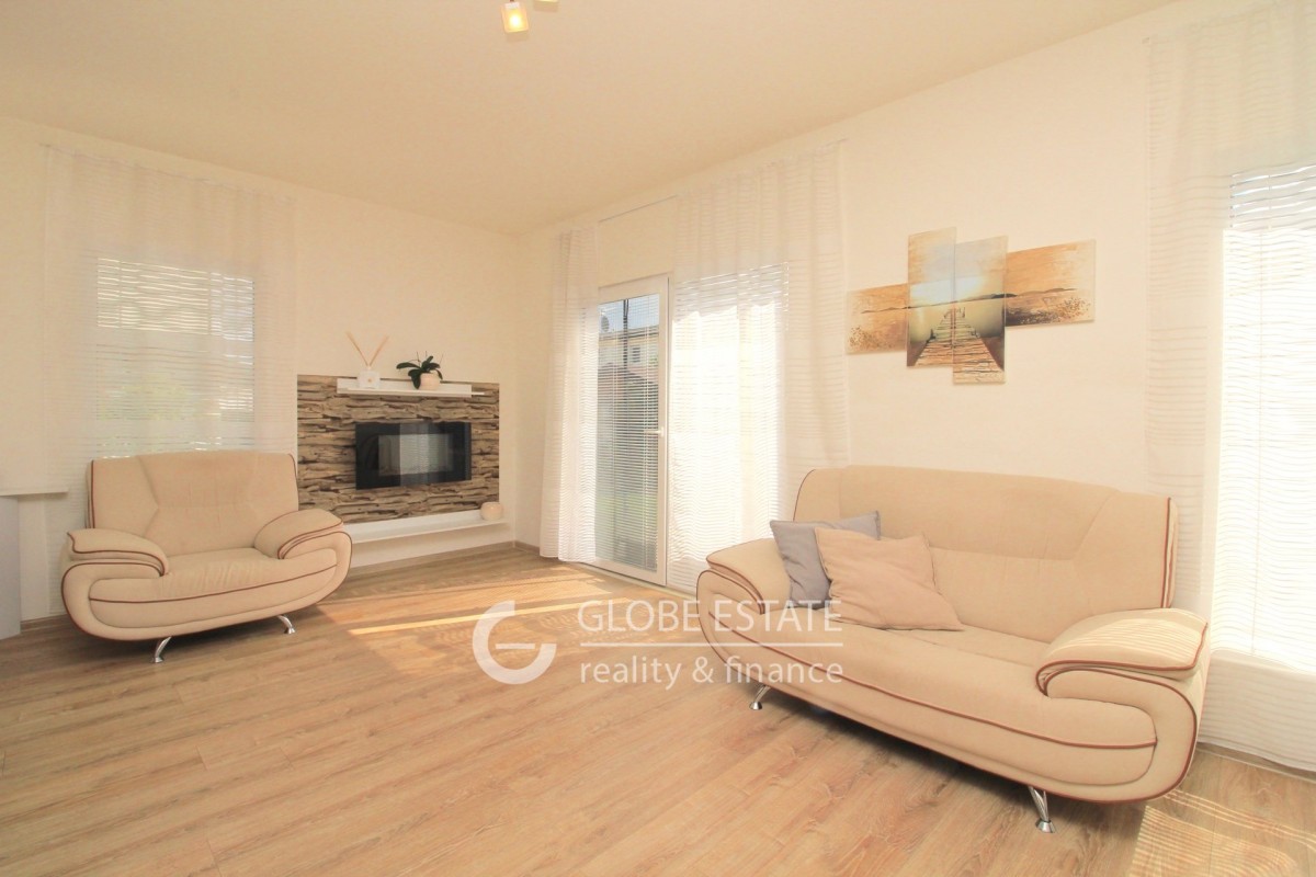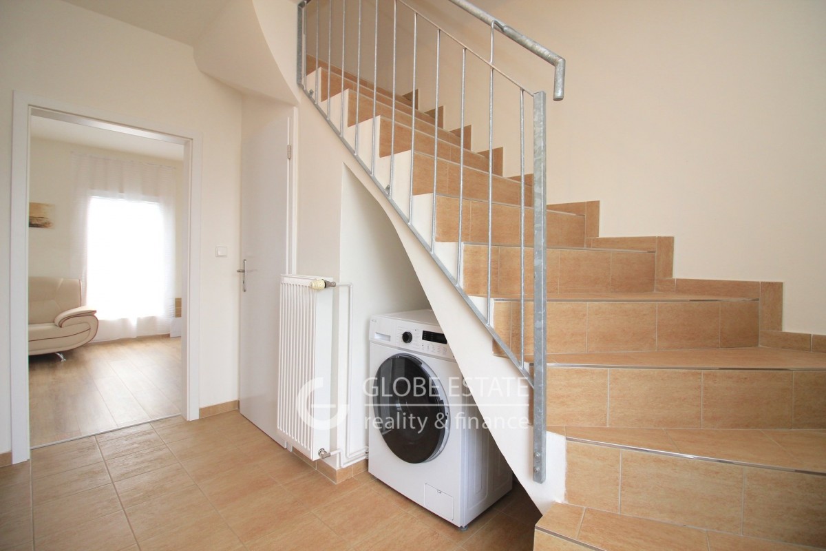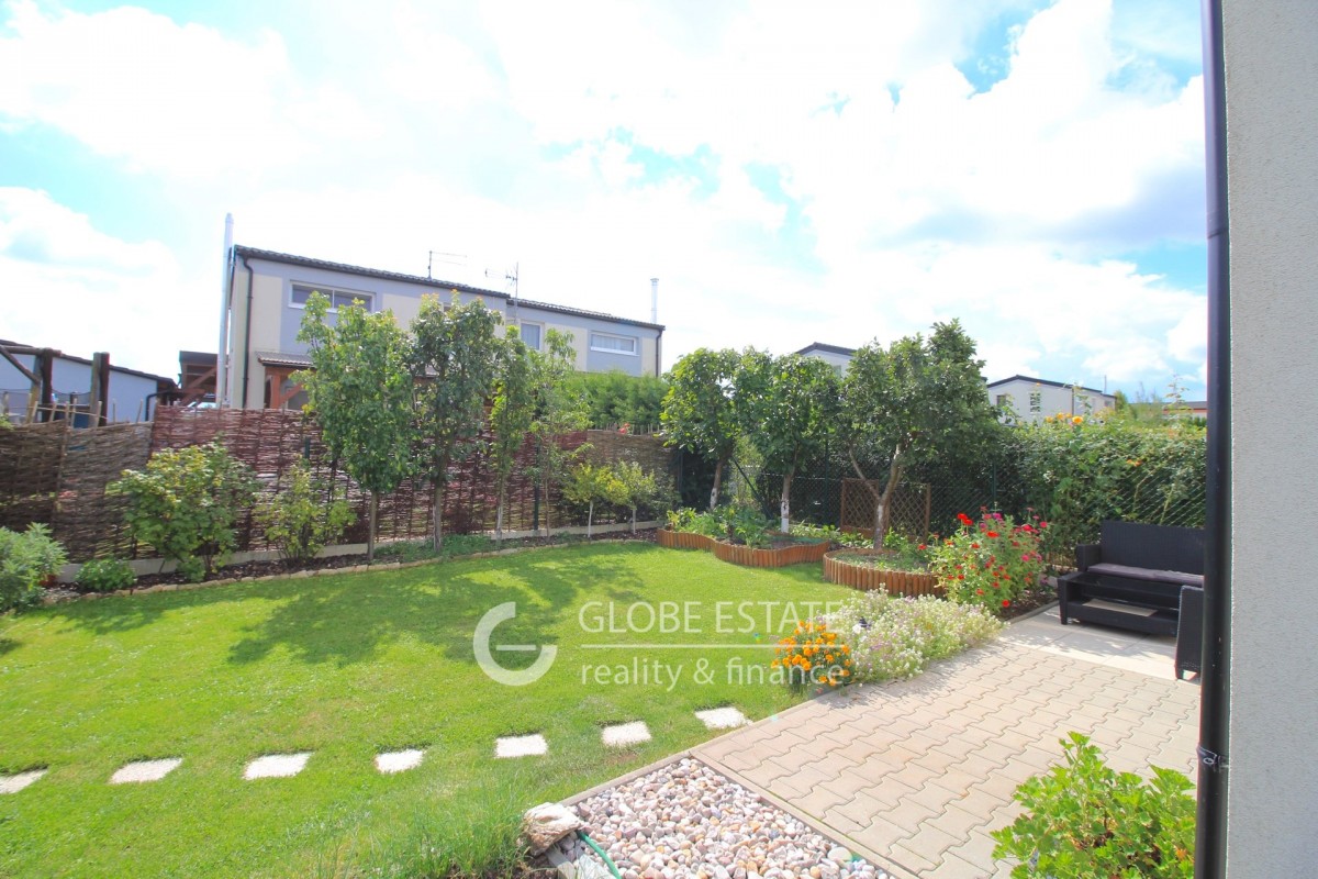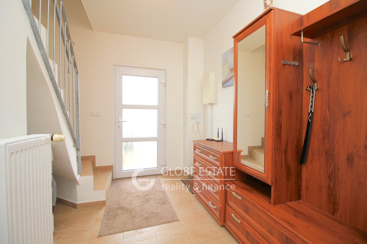 V přízemí domu se nachází chodba s botníkem a úložným prostorem, schodiště do patra, samostatná toaleta, kuchyně s plně vybavenou kuchyňskou linkou, vestavěnými spotřebiči a jídelnou, obývací pokoj s francouzským oknem a vstupem na zahradu.