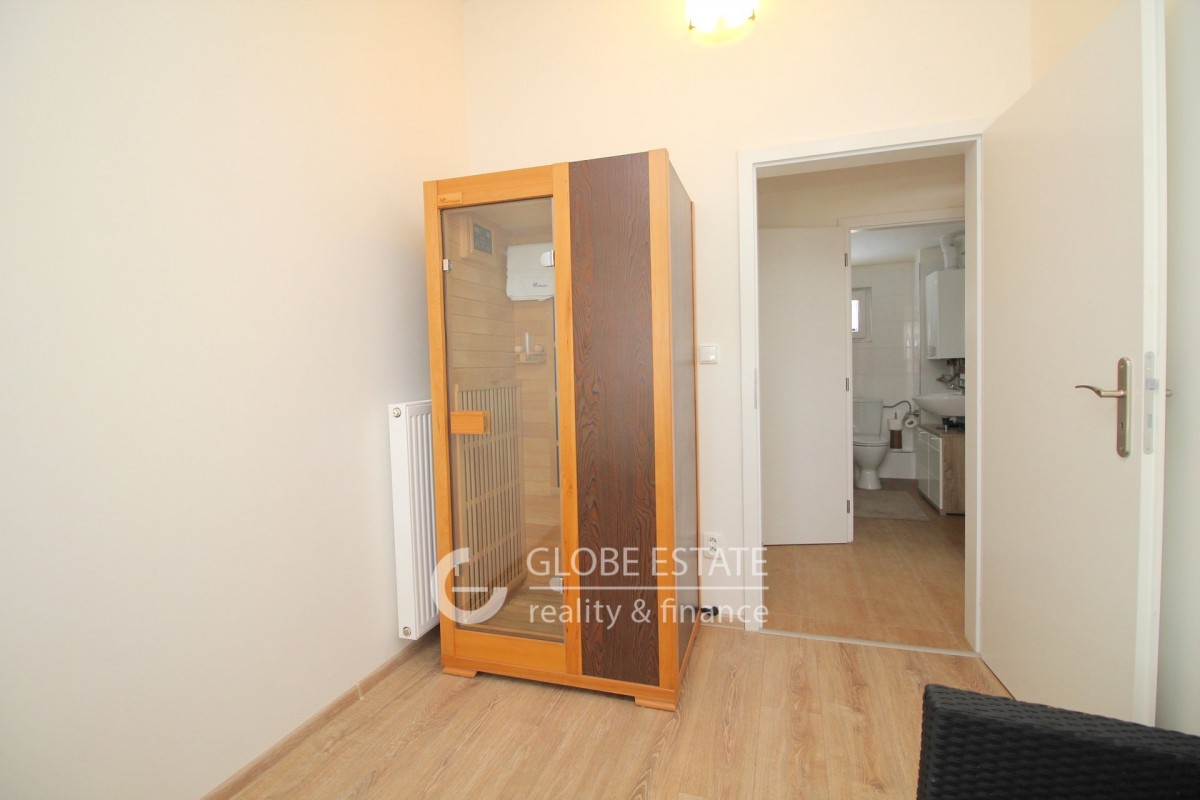 V patře jsou tři pokoje, ložnice, pracovna s infrasanou, dětský pokoj a koupelna s vanou a toaletou.