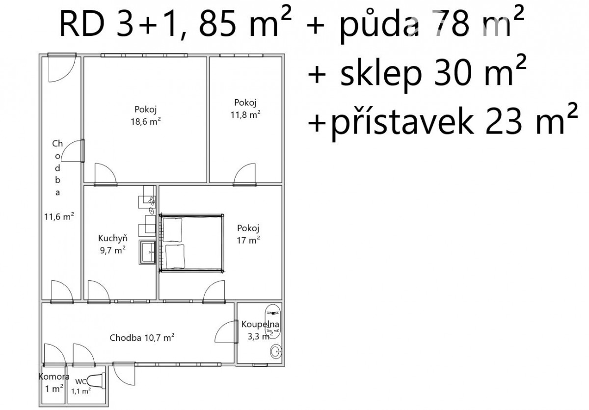 Nemovitost disponuje vstupní chodbou, třemi pokoji, kuchyní, koupelnou, samostatným sociální zařízení WC, šatnou a prosklenou verandou. Velkou výhodou je možnost rozšíření obytné plochy vybudováním dalších pokojů v půdním prostoru.