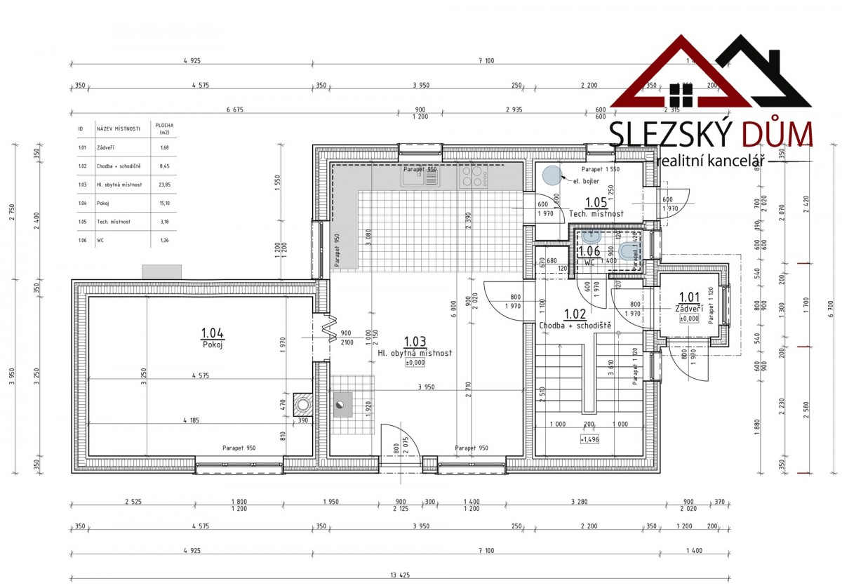 • Přízemí: zádveří, chodba se schodištěm, toaleta, prostorný obývací pokoj s kuchyňskou části a vstupem na terasu, technická místnost a obytná místnost