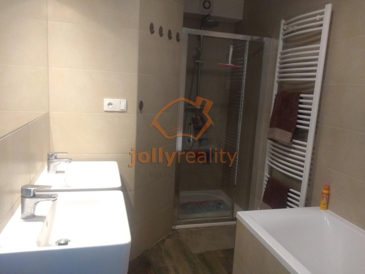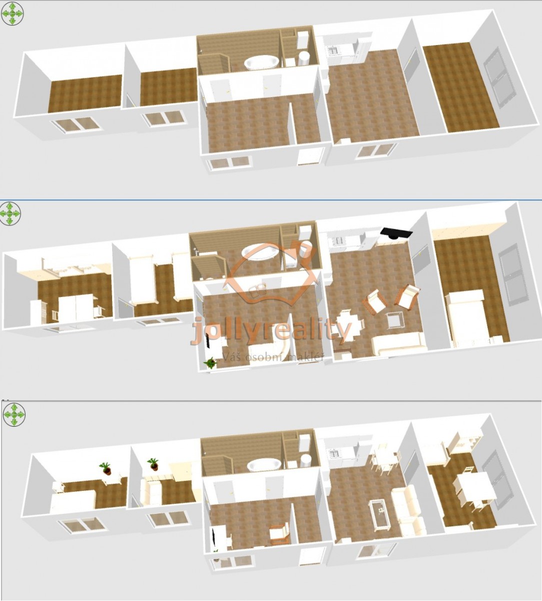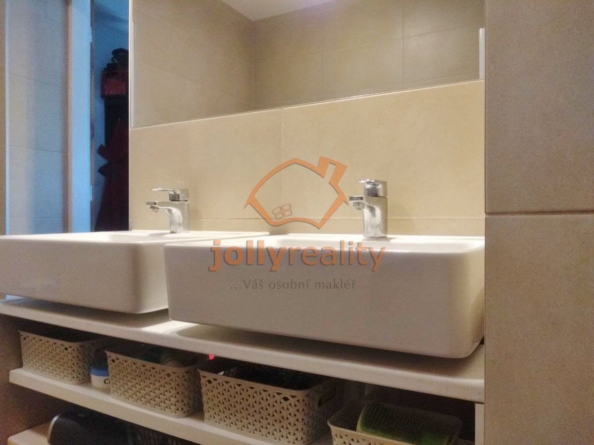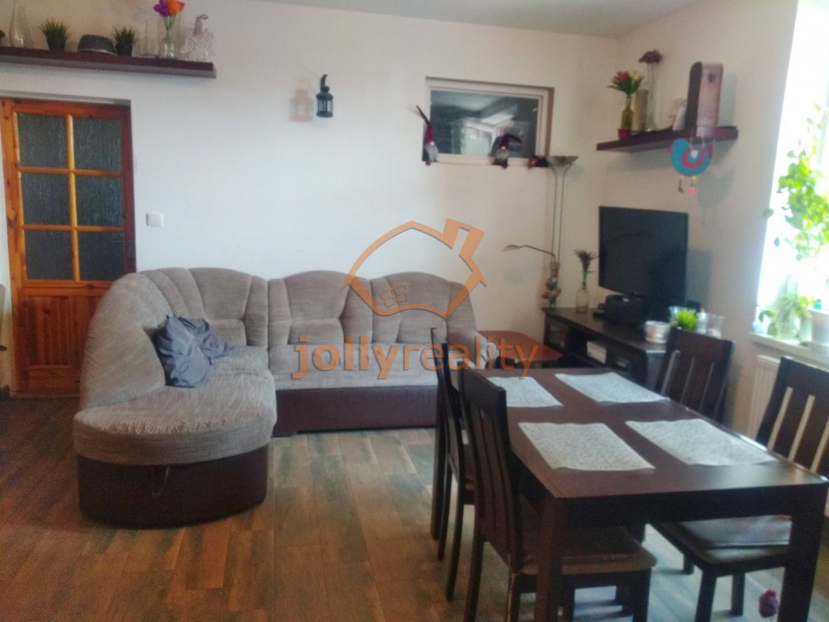 V přízemí se nachází prostorný obývací pokoj v jeho zadní části je prostorná bílá kuchyňská linka s elektrospotřebiči. Je zde dostatek místa i na velký jídelní stůl a prostornou sedací soupravu. Z obývacího pokoje jsou dveře do dětského pokojíku. Vstupní halou 16 m2 se vchází do druhé části domu, kde jsou dva průchozí pokoje, ložnice a dětský pokoj. Koupelna je vybavena sprchovým koutem, vanou, umyvadlem s toaletní skříňkou, topným žebříkem a je zde i sociální zařízení WC. V přízemí je další samostatné sociální zařízení WC pro hosty. Tato část domu je částečně podsklepená.