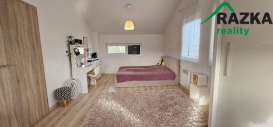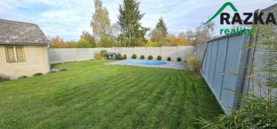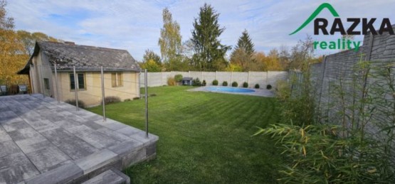 Disponuje prostorným obývacím pokojem s kuchyňskou linkou, krbovými kamny a dvěma vstupy na terasu, dvěma koupelnami, ložnicí ze šatnou a velkým dětským pokojem, dvěma komorami, zahradou s bazénem, zahradním domkem, parkovacím stáním a dvougaráží.