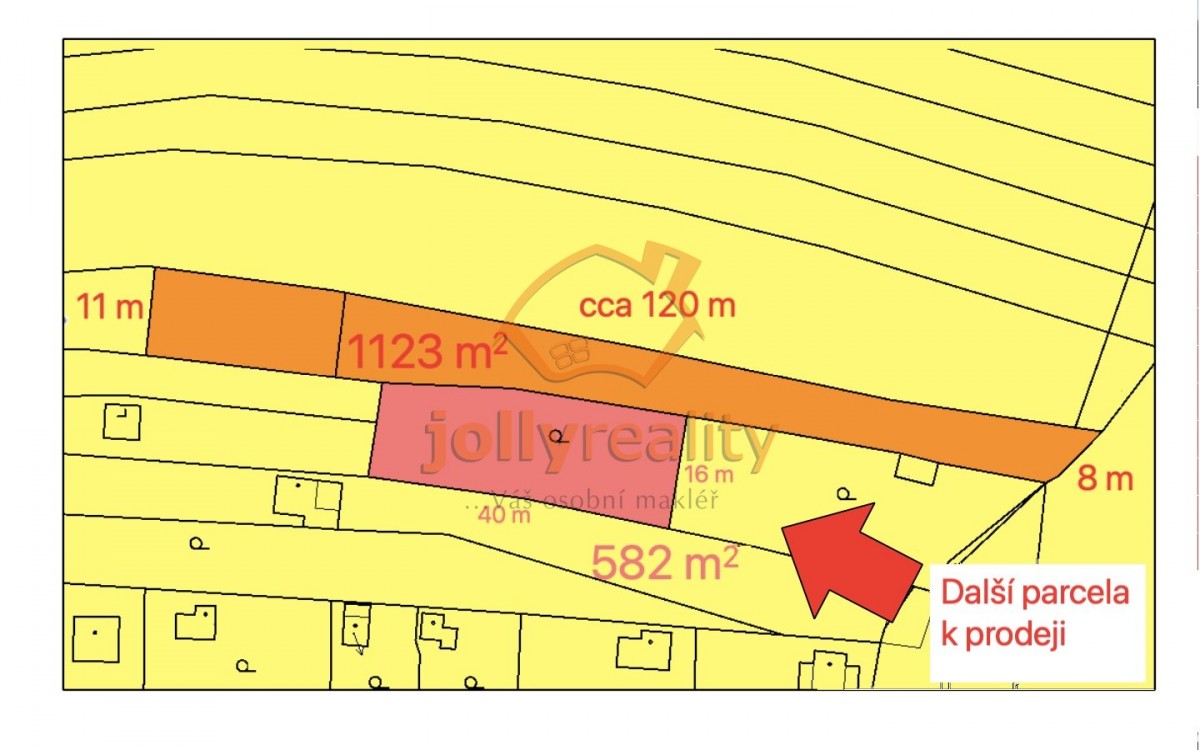 Ke stávajícímu pozemku je po dohodě možné přikoupit vedlejší parcelu 582 m2 a navýšit tak celkovou výměru na 1705 m2 (viz. nákres).
