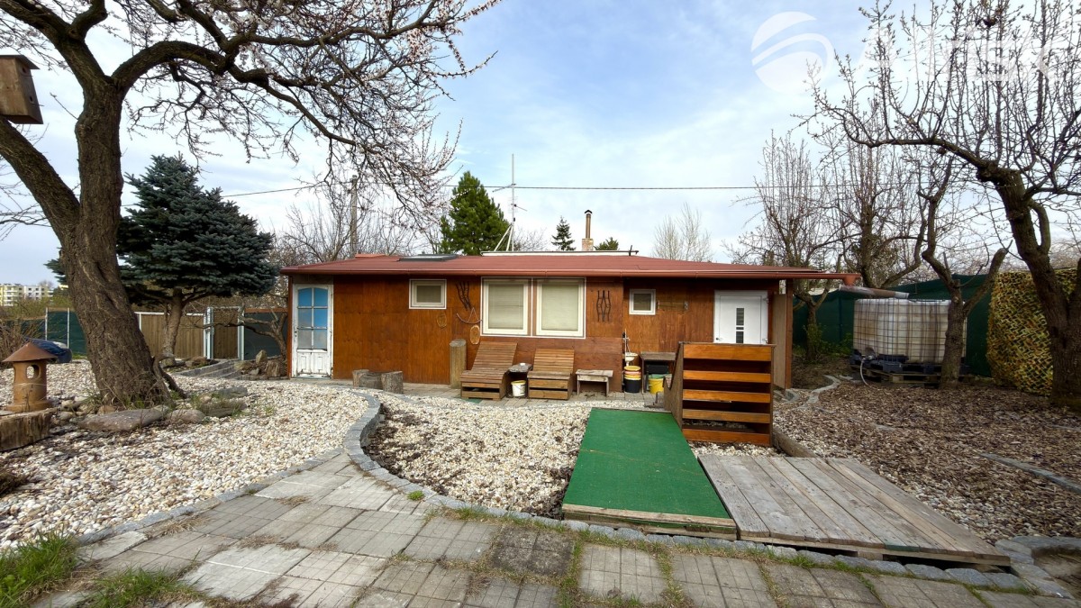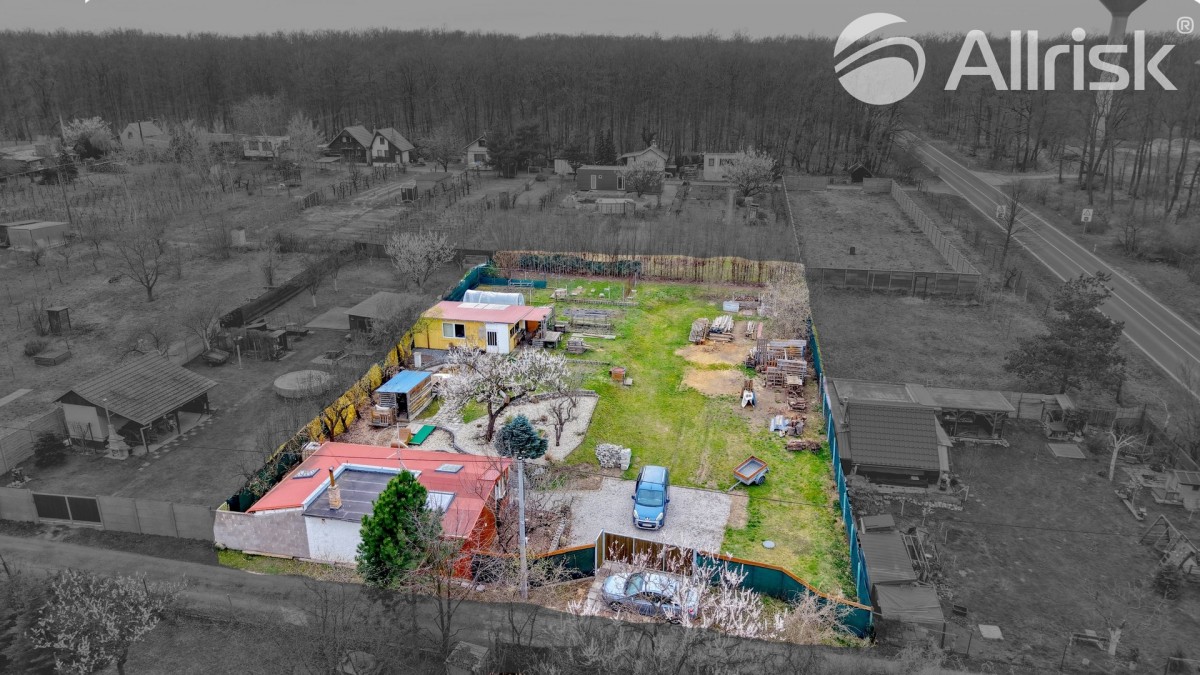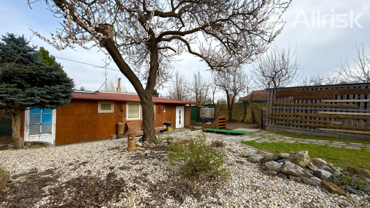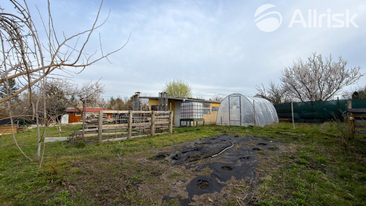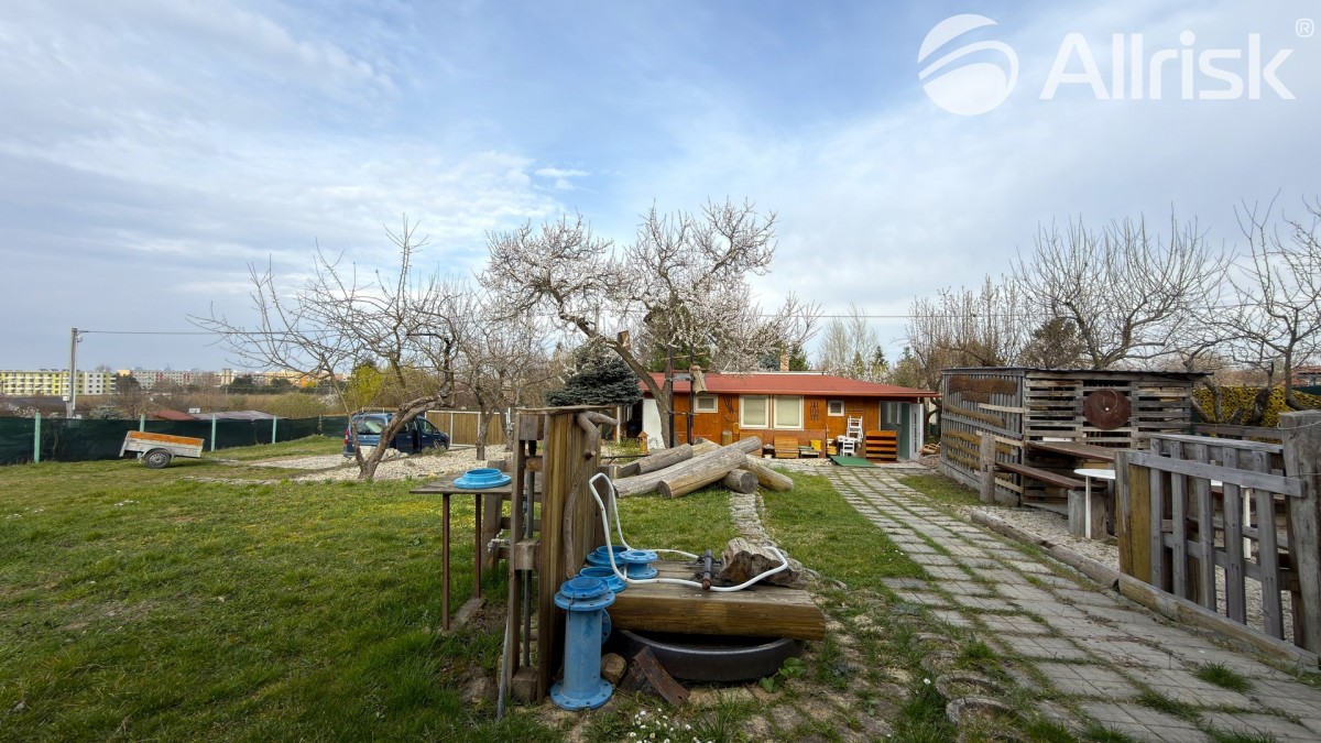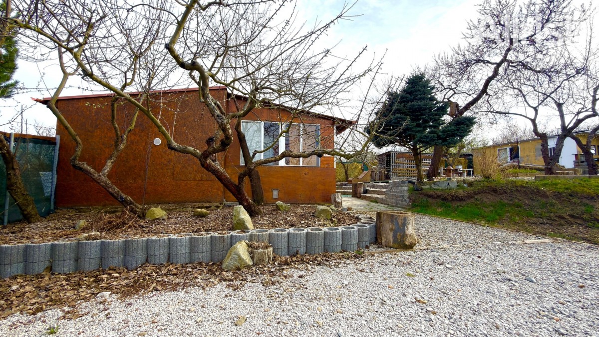 Součástí pozemku je podsklepená chata o dispozici 2+1 s kuchyňským koutem a dvěma ložnicemi. Ta nabízí příjemné zázemí pro víkendový odpočinek, ale zároveň může posloužit i jako dočasné bydlení při budoucí výstavbě vašeho vysněného domu.
