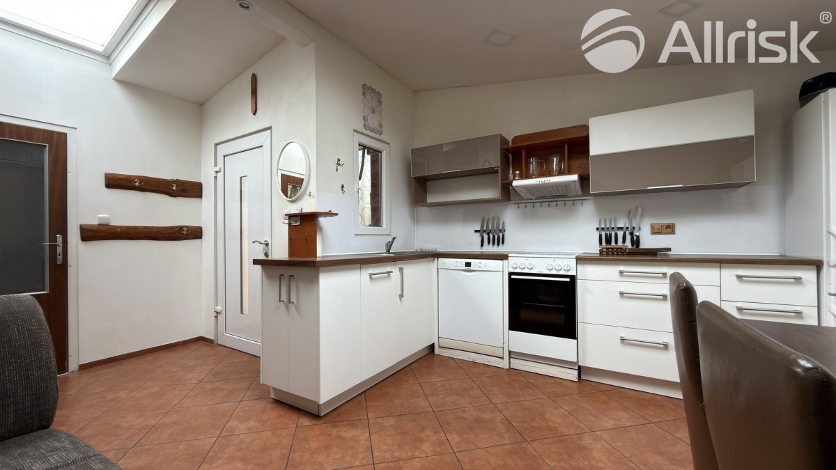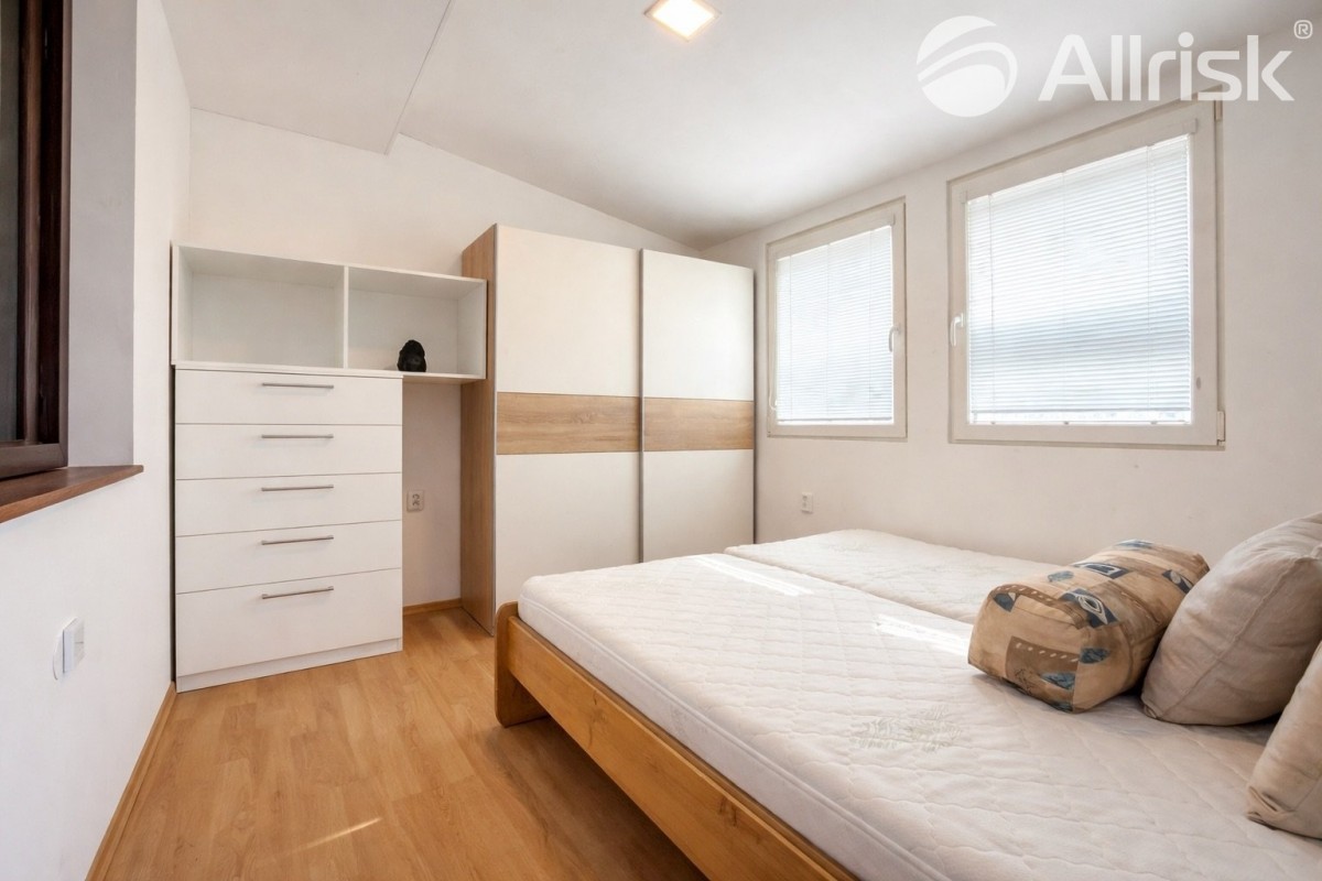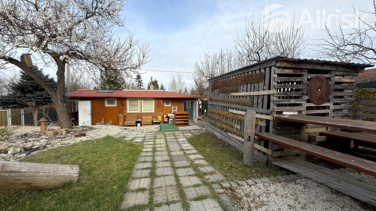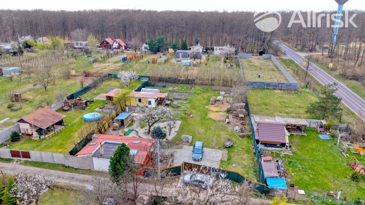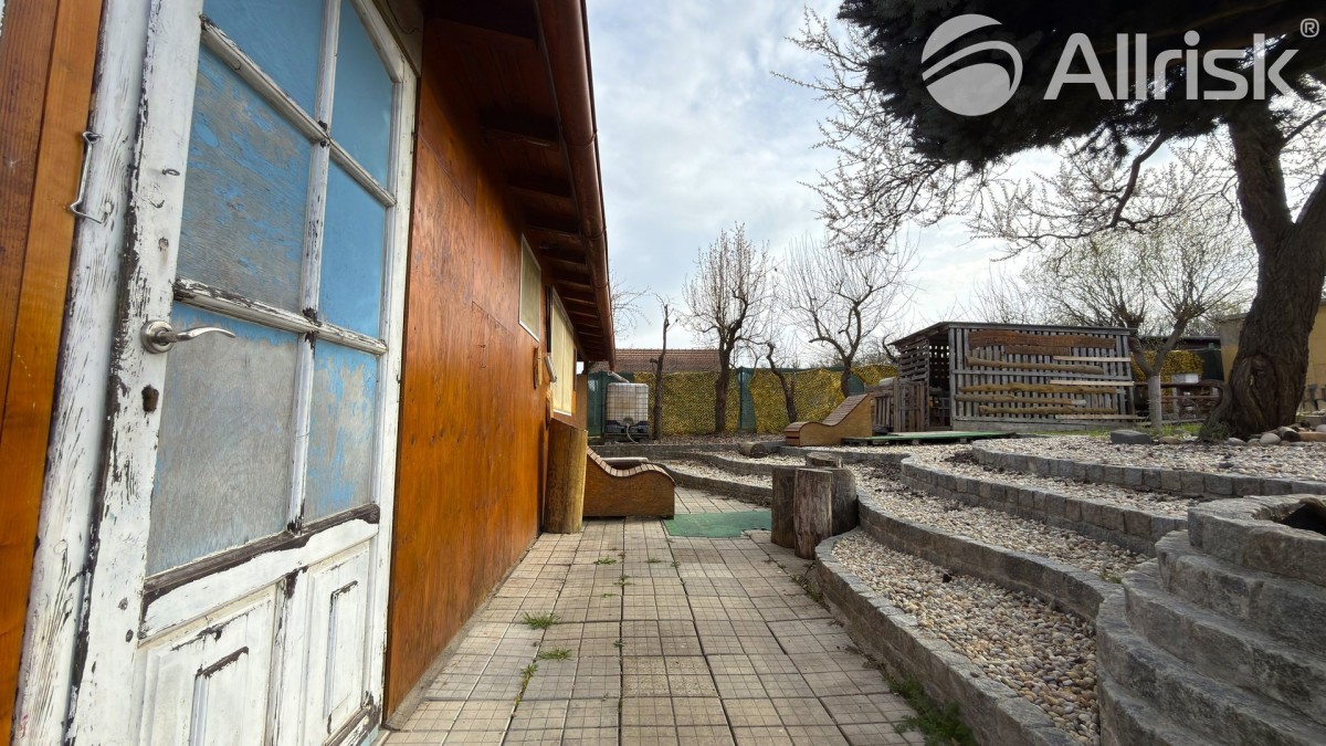 Součástí pozemku je podsklepená chata o dispozici 2+1 s kuchyňským koutem a dvěma ložnicemi. Ta nabízí příjemné zázemí pro víkendový odpočinek, ale zároveň může posloužit i jako dočasné bydlení při budoucí výstavbě vašeho vysněného domu.