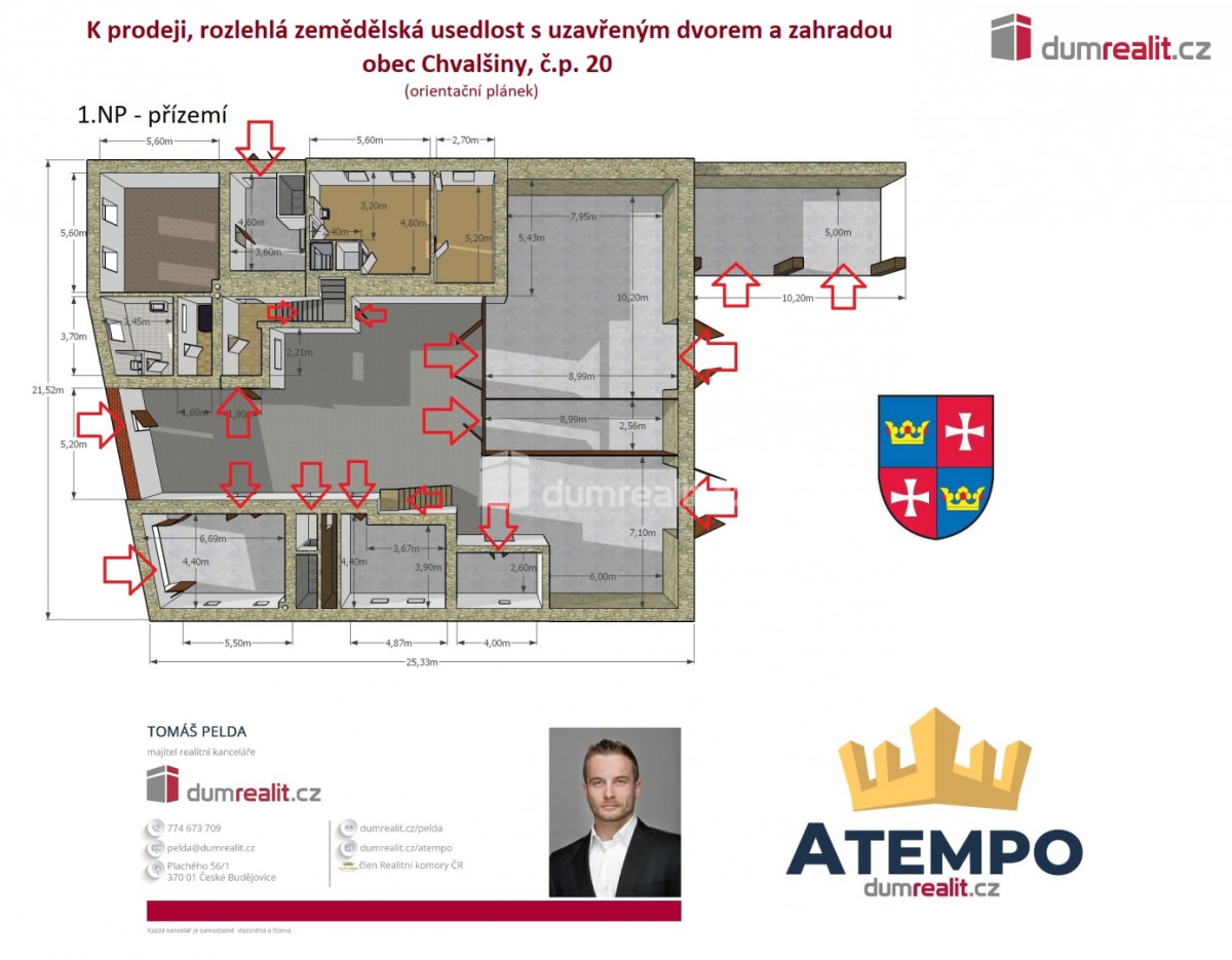Cena je včetně provize RK a právního servisu. Více info Vám poskytne makléř Tomáš Pelda. . Dumrealit. cz Vám nabízí prodej rozsáhlé zemědělské usedlosti s potenciálem vícegeneračního bydlení nebo investiční příležitosti v p...odobě vybudování více bytových jednotek a tím využití staveb, které Vám nabízíme ke koupi v obci Chvalšiny, č. p. 20. Celý komplex je vystavěn do tvaru O s vybetonovaným uzavřeným dvorem, na který navazuje zahrada o výměře 800 m². Hlavní obytný objekt je částečně podsklepený, má obdélníkový tvar a je vystavěn ze smíšeného zdiva do 2 nadzemních podlaží s novou střešní krytinou. Dům má 2 samostatné vchody: 1) z ulice; 2) ze dvora. V 1. NP (první nadzemní patro) - přízemí lze pohodlně vybudovat 2 bytové jednotky. Ve 2. NP (druhé nadzemní patro) - 1 patro je hlavní bytová jednotka 3+1 s pavlačí. Vytápění je kotlem na tuhá paliva, ohřev vody je elektrickým bojlerem. Dispozici jednotlivých podlaží a všech staveb naleznete na orientačním plánku mezi fotografiemi. Součástí komplexu je druhá budova, kde se nachází v přízemí garáž, dílna, chlévy a v patře nad vypsaným zázemím se nachází další prostory ke komerčnímu využití nebo k bydlení! Uzavřený dvůr uzavírá stodola o podlahové ploše 140 m²! Usedlost je připojena na veřejný vodovod, obecní kanalizaci, elektřinu a plyn! K dispozici máme vyjádření sítí (elektřina, plyn, voda, kanalizace). Možnost dokoupení stavební parcely u domu o výměře 800 m² s přípojkou elektřiny a projektem na připojení inženýrských sítí. Doporučuji prohlídku, jen začít. Více info Vám poskytne realitní makléř Tomáš Pelda z realitní kanceláře A TEMPO fungující pod ochrannou známkou dumrealit. cz. Ev. číslo: 648898. Energetický štítek: G